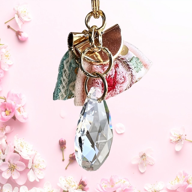 サンキャッチャーバッグチャーム・桜結び ■コンセプト 満開の桜を思わせるピンクのインド刺繍リボンを贅沢に2種類束ね、天然石とともに「桜結び」に仕立てました。(インド刺繍リボンに膨らみをもたせるため、リボンを縫い込みクッションを入れています) 先端でクリスタルが揺れる、持ち歩けるサンキャッチャーです。 自分にとって不要なものを浄化し、誰かのためでなく、自分自身へもっと愛情を注いであげること。それこそが、本当の癒しに繋がっていきます。太陽の光を虹に変えてバッグに纏い、心軽やかにお過ごしください。 ※インド刺繍とは:インドの伝統工芸で、繊細な糸とスパンコールが織りなす煌びやかで立体的なデザインが特徴です。 ■パワーストーンの意味 ・ローズクォーツ: 愛と優しさの象徴。自分自身を許し、愛する心を育みます。 ・ラベンダーアメジスト: 神経を癒やし、安らぎを与える石。不安を取り除き冷静さを取り戻します。 ・水晶(ウェーブカット): 優れた浄化作用を持ち、他の石のパワーを引き出します。 ■カラーセラピー このバッグチャームは「第4チャクラ(ハートチャクラ)」に対応しています。 第4チャクラが整うと、自分を否定することなくありのまま受け入れられるようになり、周囲へも無償の愛を注げるような、穏やかで満たされた心へ導かれます。 ■サイズ ・全長:約161mm ・サンキャッチャー(しずく型):縦 約38mm × 横 約22mm 厚さ 約12mm ・重さ:約22.4g ■素材 ・クリスタルガラス(しずく型) ・インド刺繍リボン ・天然石(ローズクォーツ、ラベンダーアメジスト、水晶) ・チェーン、金具等 ■取り扱い注意 トップ部分にはガラス製のクリスタルを使用しています。繊細な素材のため、落下や強い衝撃が加わると「カケ」や「割れ」の原因となります。 バッグ等に取り付ける際は、ぶつけやすい場所を避けるなど、お取り扱いにご注意ください。