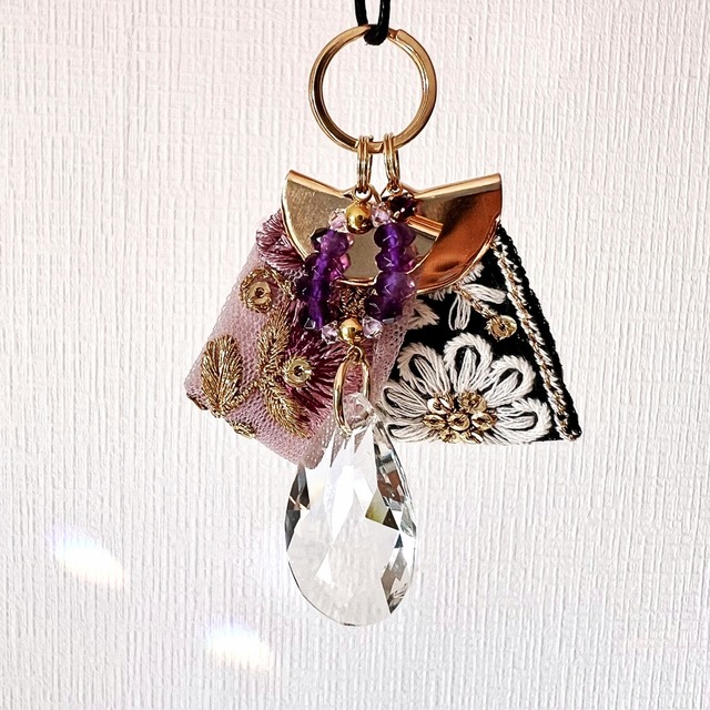 キーチャーム・アンティークドレス ※キーチャームとは? キーホルダーやバッグチャームとして、日々の暮らしにさりげない彩りと光を添える、ラピスローズオリジナルのアイテムです。 シックな黒と鮮やかなマゼンタのコントラスト。重厚なインド刺繍リボンに、神秘的な三日月とクリスタルガラスを合わせました。 キーホルダーやストラップ、バッグチャームなどにプラスするだけで、日常が華やかになることを感じていただけます。 ■アンティークドレス シックな黒地に白とゴールドの花々が咲くリボンと、ハッとするほど鮮やかなマゼンタのリボン。質感の異なる2枚を贅沢に重ね合わせました。 2つのインド刺繍リボンがふわりと広がるような優雅なシルエット。二つのリボンが、まるでアンティークドレスを思わせるようなデザインです。 お出かけの際、バッグや鍵につけて歩くたび、しずく型のクリスタルが光を集めて優しく揺れます。インド刺繍リボンから感じられるアンティークな雰囲気を、あなたの日常に取り入れてみて下さい。 ■カラーセラピー(マゼンタ・ゴールド・白・ブラック) ・マゼンタ:深い慈愛と情熱を表します。日常にハッとするような華やかさと、女性らしい艶やかさをプラスしてくれます。 ・ゴールド:華やかさと豊かさを表します。日常に上質な輝きをプラスしてくれます。 ・白:黒地の中にある白が、その純粋さを明確に表現しています。闇に浮かび上がる神聖さを表現しました。 ・ブラック:自分自身の軸をしっかり持ち、周囲に流されない強い意志を象徴する色です。 ■第1・第8チャクラに対応 第1チャクラ(赤・黒)は地に足をつけ、自分らしく生きる土台となる場所です。 また、マゼンタは第8チャクラに対応し、より高い視点から自分を見つめ、内なる美しさを引き出すサポートをしてくれます。 ■サイズ ・全長:約72mm(金具からインド刺繍まで) ・サンキャッチャー(しずく型):縦 約28mm × 横 約18mm × 厚さ 約10mm ・重さ:約11.0g ■素材 ・クリスタルガラス(しずく型) ・インド刺繍リボン(ブラック・マゼンタ・ゴールド・白など) ・三日月チャーム(ゴールド系) ・ゴールド系パーツ ・金具(二重リング等) ■取り扱い注意 トップ部分にはガラス製のクリスタルを使用しています。繊細な素材のため、落下や強い衝撃が加わると「カケ」や「割れ」の原因となります。 鍵やバッグ等に取り付ける際は、硬い壁や床にぶつけないよう、お取り扱いに十分ご注意ください。