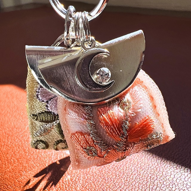 キーチャーム・三日月ブーケ ※キーチャームとは? キーホルダーやバッグチャームとして、日々の暮らしに「彩り」と「光」を添える、ラピスローズオリジナルのアイテムです。 春の夜空に浮かぶ三日月と、陽だまりのような温かさを纏った花々の刺繍リボンを合わせました。 手にするたび、幻想的な光と花の香りに包まれるような、穏やかで前向きな心地よさを感じていただけます。 家の鍵やポーチ、ストラップなど、小物としてもお使いいただけるアイテムです。 ■三日月ブーケ 春の訪れを告げる柔らかな光を、一束のブーケ(花束)のようにふっくらと結び合わせました。 シルバーに輝く三日月は、静寂と知性の象徴。そこにオレンジやピンクの温かな手縫いの刺繍を重ねることで、大人の可愛らしさと開放的なエネルギーを表現しています。 「三日月ブーケ」は、忙しい日常の中でも自分自身の「好き」を大切にし、心地よいリズムで明日を迎えたいと願うあなたに寄り添う、特別なお守りです。 ■カラーセラピー(オレンジ・ピンク・淡いコーラル) ・オレンジ: 太陽のような喜びと活力を与え、心をポジティブに整えてくれる色です。 ・ピンク: 自分を慈しみ、無条件の愛で包み込む「自分へのご褒美」を象徴する色です。 ・淡いコーラル:繊細さを意味するコーラルは、傷ついた心を癒すための色です。まわりとのつながりを大切にしながら、自分らしく生きることをサポートする色です。 ■第2・第4チャクラに対応 ・第2チャクラ: 「生きる喜び」や「創造性」に関連する場所です。春の芽吹きのようなワクワクする気持ちを呼び覚まします。 ・第4チャクラ: 「愛」と「癒やし」に関連する場所です。心の扉を優しく開き、自分自身を認めて愛する力を育みます。 ■サイズ ・全長: 約88mm ・サンキャッチャー(しずく型): 縦 約28mm × 横 約16mm × 厚さ 約10mm ・重さ: 約15.4g ■素材 ・クリスタルガラス(しずく型) ・インド刺繍リボン(淡いコーラル・オレンジ・ピンク・紫など) ・チャーム(シルバー系の三日月チャーム) ・金具(二重リング等) ■取り扱い注意 トップ部分にはガラス製のクリスタルを使用しています。繊細な素材のため、落下や強い衝撃が加わると「カケ」や「割れ」の原因となります。 鍵やバッグ等に取り付ける際は、硬い壁や床にぶつけないよう、お取り扱いにご注意ください。