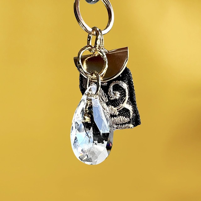 キーチャーム・アンティークノワール ※キーチャームとは? キーホルダーやバッグチャームとして、日々の暮らしにさりげない彩りと光を添える、ラピスローズオリジナルのアイテムです。 シックなブラックを基調とし、白とゴールドの糸を使ったインド刺繍リボンに、時を刻むようなローマ数字のリングと一粒の赤いストーンチャーム、そしてクリスタルガラスを合わせました。 キーホルダーやストラップ、バッグチャームなどにプラスするだけで、日常が華やかになることを感じていただけます。 ■アンティークノワール このインド刺繍リボンは、究極にシックで洗練された、大人のための黒(ノワール)が主役です。シックな黒地に白とゴールドの花々が咲き誇る、クラシカルなインド刺繍リボンが特徴です。優雅な花のシルエットは、まるでモノトーンの美しいドレスを思わせるデザインです。 そこに添えたのは、アンティーク時計のようなローマ数字のゴールドリングが、シックの中にも華やかさを演出しています。 お出かけの際、バッグや鍵につけて歩くたび、しずく型のクリスタルが光を集めて優しく揺れます。甘さを抑えた気高い黒の魅力を、あなたの日常に取り入れてみて下さい。 ■カラーセラピー(ブラック・ゴールド・ホワイト) ・ブラック:自分自身の軸をしっかり持ち、周囲に流されない強い意志を象徴する色です。 ・ゴールド:華やかさと豊かさを表します。日常に上質な輝きをプラスしてくれます。 ・ホワイト:何色にも染まらない白は、あらゆる可能性と受難さを持ち合わせた色です。 ■第1・第3チャクラに対応 強い信念を持つ黒は、第1チャクラの地に足をつけ、自分らしく揺るぎない生きる土台となる場所です。 ゴールドは第3チャクラに対応し、自分への自信や「やり遂げる力」、ポジティブなエネルギーを高めてくれるサポートをしてくれます。 ■サイズ ・全長:約60mm ・サンキャッチャー(しずく型):縦 約28mm × 横 約18mm × 厚さ 約10mm ・重さ:約8.2g ■素材 ・クリスタルガラス(しずく型) ・インド刺繍リボン(ブラック・ゴールド・白など) ・ローマ数字リングパーツ(ゴールド) ・ストーンチャーム(レッド) ・ゴールド系パーツ ・金具(二重リング等) ■取り扱い注意 トップ部分にはガラス製のクリスタルを使用しています。繊細な素材のため、落下や強い衝撃が加わると「カケ」や「割れ」の原因となります。 鍵やバッグ等に取り付ける際は、硬い壁や床にぶつけないよう、お取り扱いに十分ご注意ください。