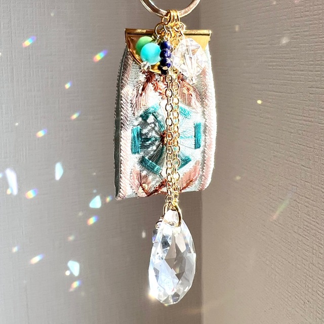 サンキャッチャーバッグチャーム・アンデスのお守り ■コンセプト 南米アンデスの伝統織物を思わせる、ターコイズブルーの幾何学的な刺繍リボンを使用しました。(インド刺繍リボンに膨らみをもたせるため、リボンを縫い込みクッションを入れています) サンキャッチャーでありながら、持ち運びのできるバッグチャームに仕立てました。 ストレスを解消し、心身のバランスを取りながら、もっと本来の自分を表現したり、人間関係を円滑にし、自己肯定感を高めることを意識して作りました。 誰かのためではなく、自分らしくあるための「お守り」としてお持ちください。 太陽の光を虹に変えてバッグに纏い、心軽やかにお過ごしください。 ※インド刺繍とは:インドの伝統工芸で、繊細な糸とスパンコールが織りなす煌びやかで立体的なデザインが特徴です。 ■パワーストーンの意味 ・アマゾナイト: 「希望の石」。迷いを取り去り、未来への希望をもたらします。 ・アパタイト: 自己実現やコミュニケーションに働きかけ、周囲との関係を円滑にします。 ・水晶(カット): 優れた浄化作用を持ち、他の石のパワーを引き出します。 ■カラーセラピー このバッグチャームは「第5チャクラ(喉のチャクラ)」に対応しています。 第5チャクラが整うと、自分の本音を素直に言葉にできるようになり、創造性やコミュニケーション能力が高まります。言いたいことが言えない、自分を抑えてしまう時におすすめです。 ■サイズ ・全長:約180mm ・サンキャッチャー(しずく型):縦 約28mm × 横 約11mm 厚さ 約10mm ・重さ:約14.8g ■素材 ・クリスタルガラス(しずく型) ・インド刺繍リボン ・天然石(アマゾナイト、アパタイト、水晶) ・チェーン、金具等 ■取り扱い注意 トップ部分にはガラス製のクリスタルを使用しています。繊細な素材のため、落下や強い衝撃が加わると「カケ」や「割れ」の原因となります。 バッグ等に取り付ける際は、ぶつけやすい場所を避けるなど、お取り扱いにご注意ください。