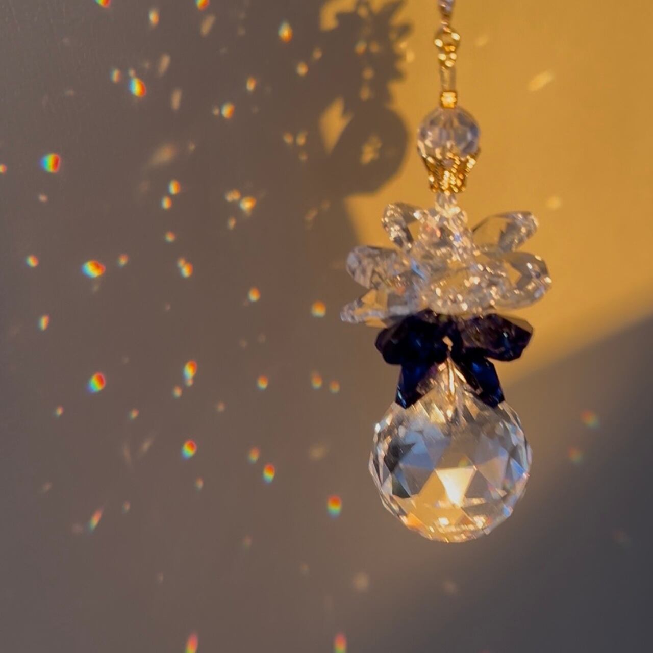 太陽の光を受けるたびに、クリスタルが虹のプリズムを放ち、ロイヤルブルーの神秘的な輝きとクリアの澄んだ光が響き合います。
