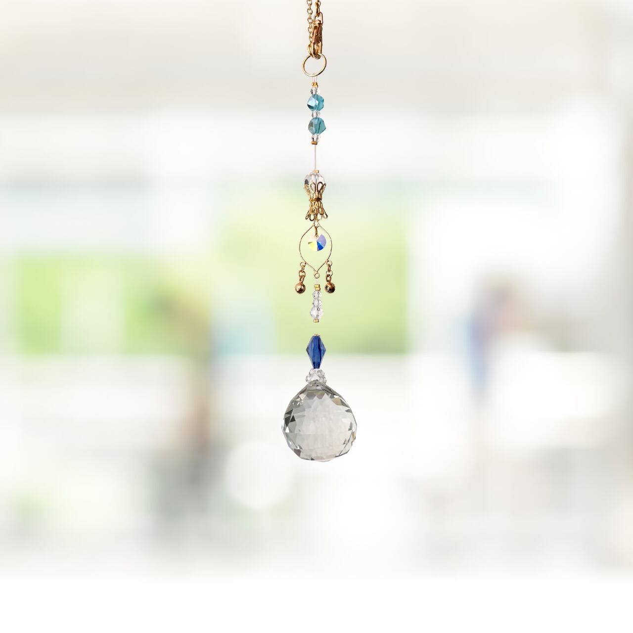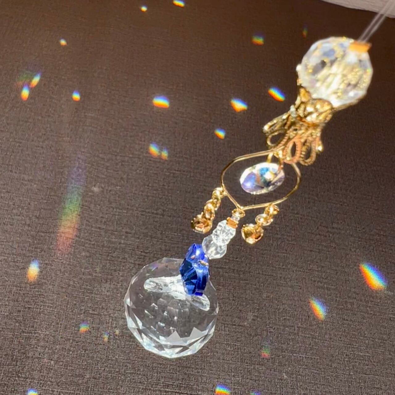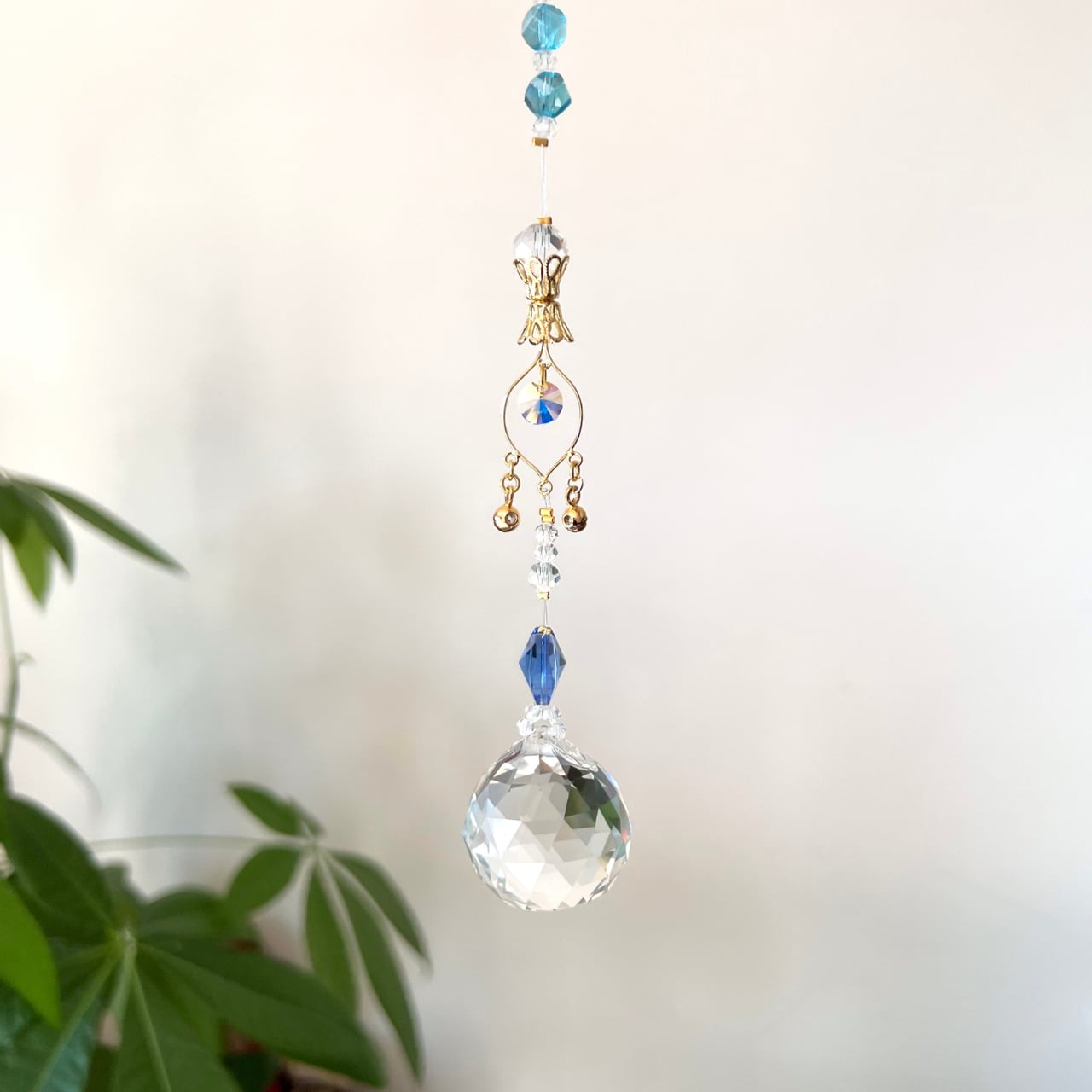 繊細に多面体カットされたクリスタルガラスと、深みのあるブルー・アクア・クリアのビーズで構成されたサンキャッチャーです。