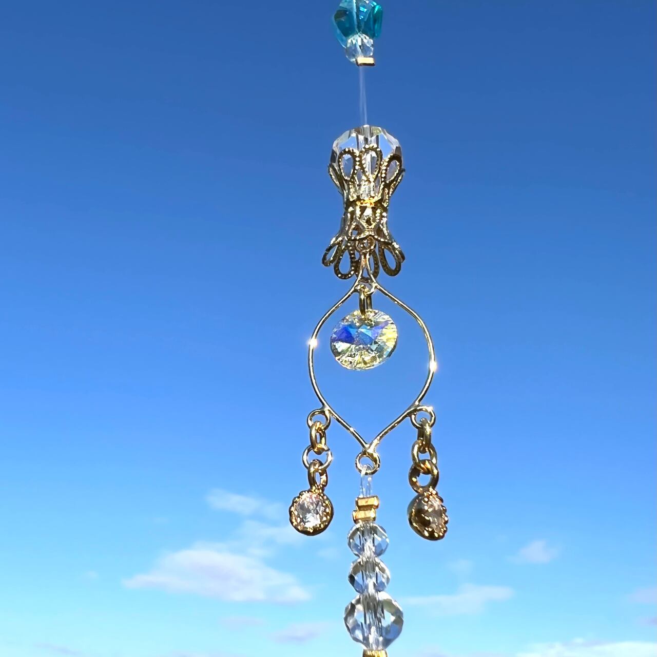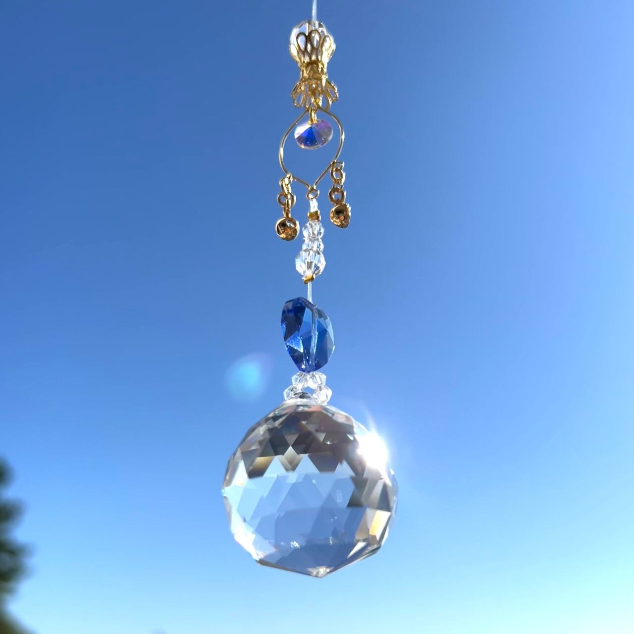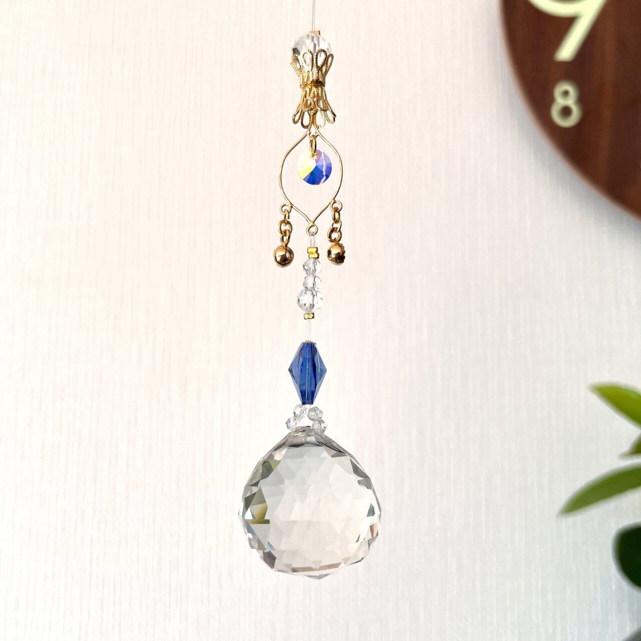 繊細に多面体カットされたクリスタルガラスと、深みのあるブルー・アクア・クリアのビーズで構成されたサンキャッチャーです。