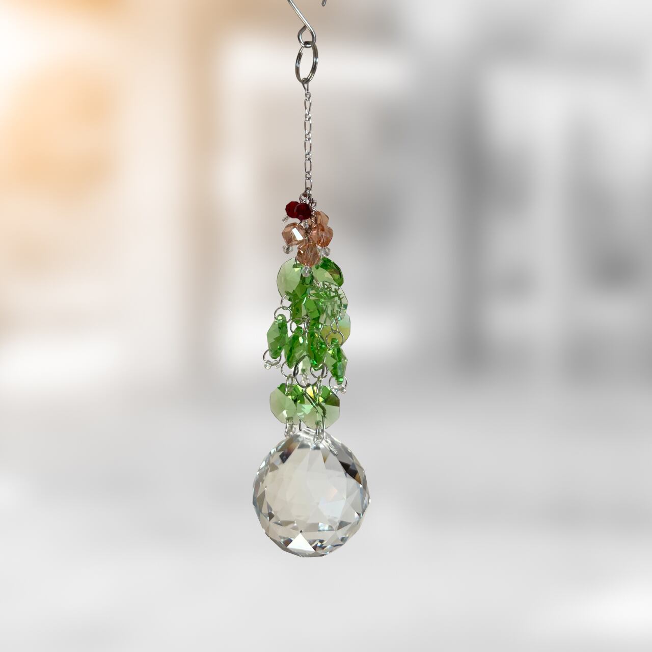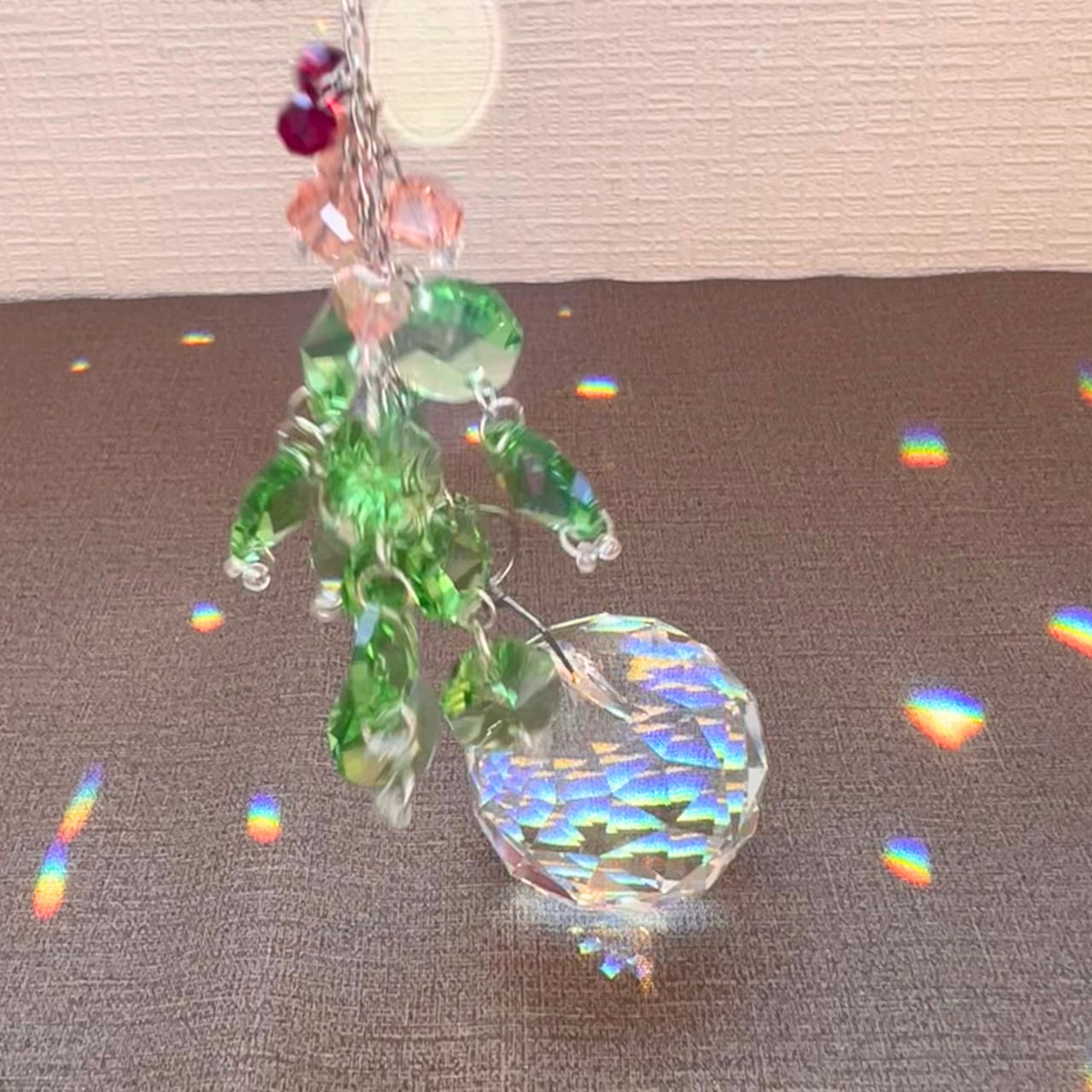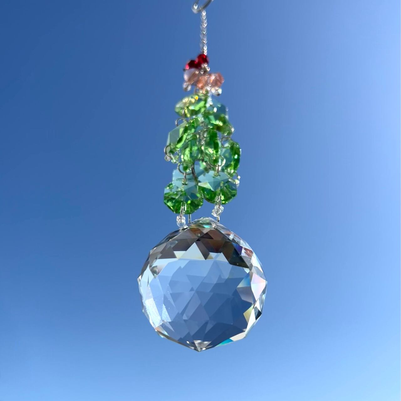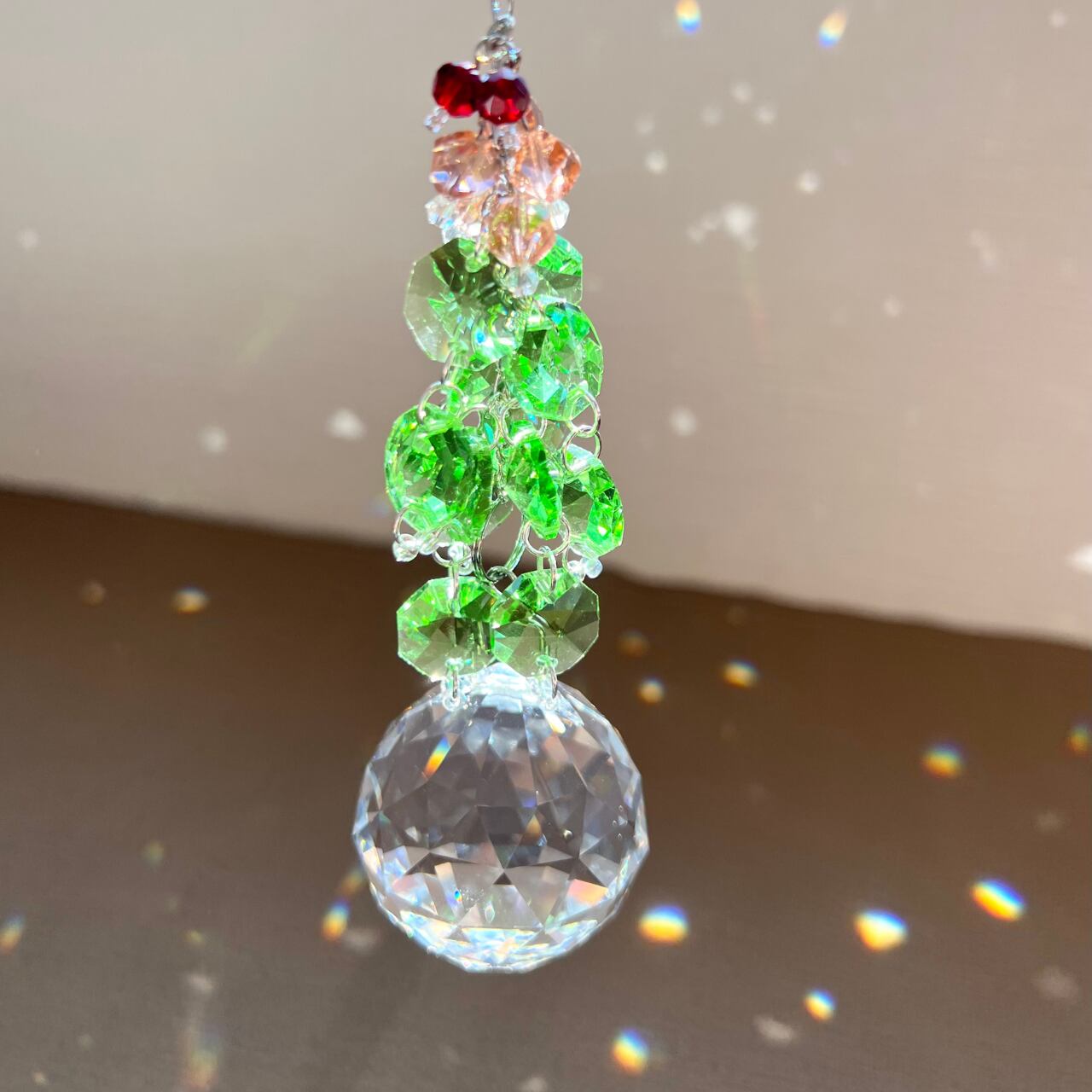繊細に多面体カットされたクリスタルガラスと、深いグリーンを基調にしたビーズで構成されたサンキャッチャーです。光を受けるたびに無数のプリズムが放たれ、まるで木漏れ日の中にいるような安らぎをもたらします。