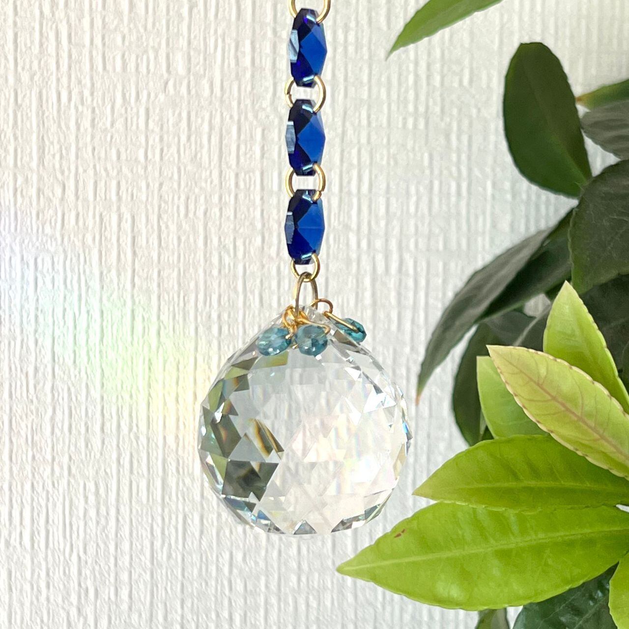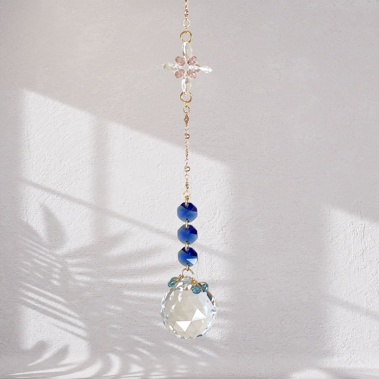 繊細に多面体カットされたクリスタルガラスと、深みのあるブルー・やわらかなピンク・クリアのビーズで構成されたサンキャッチャーです。