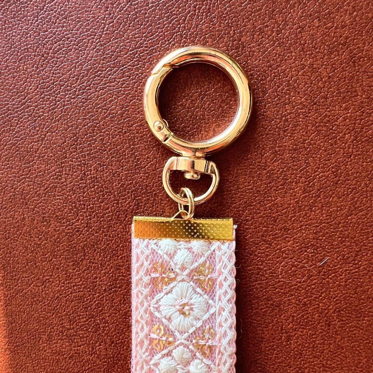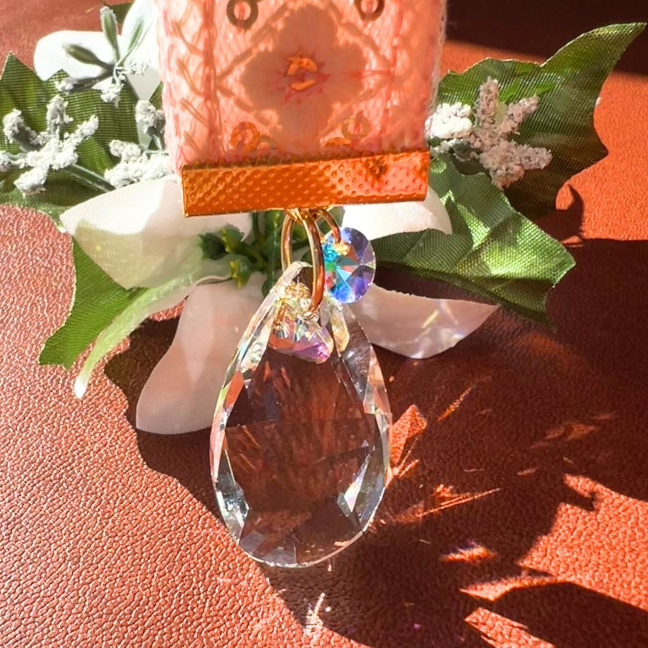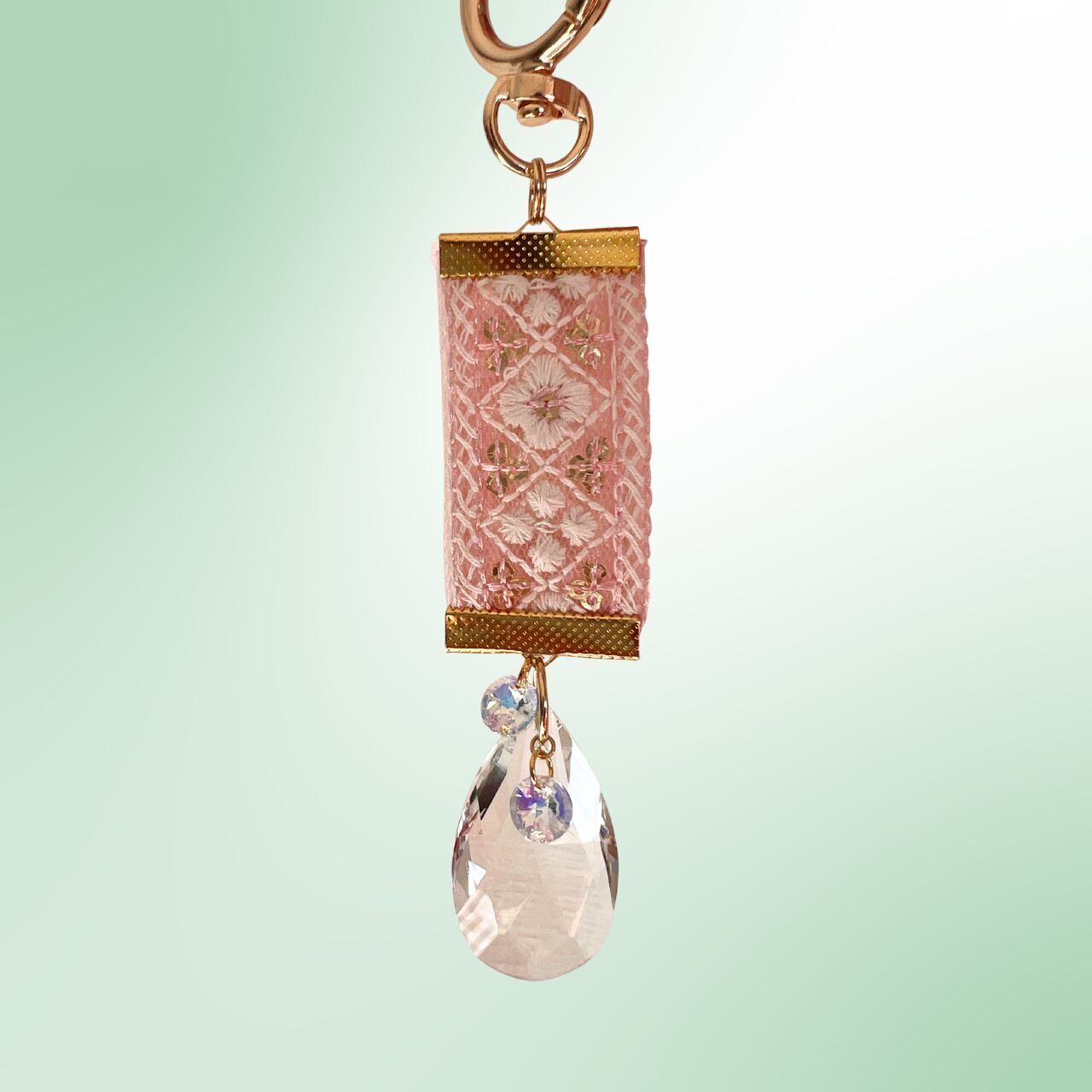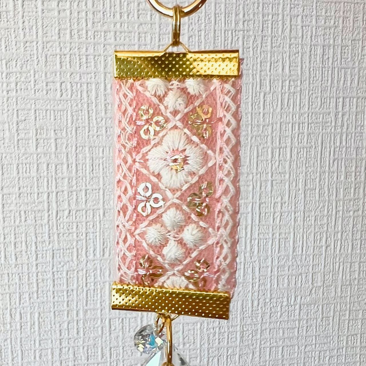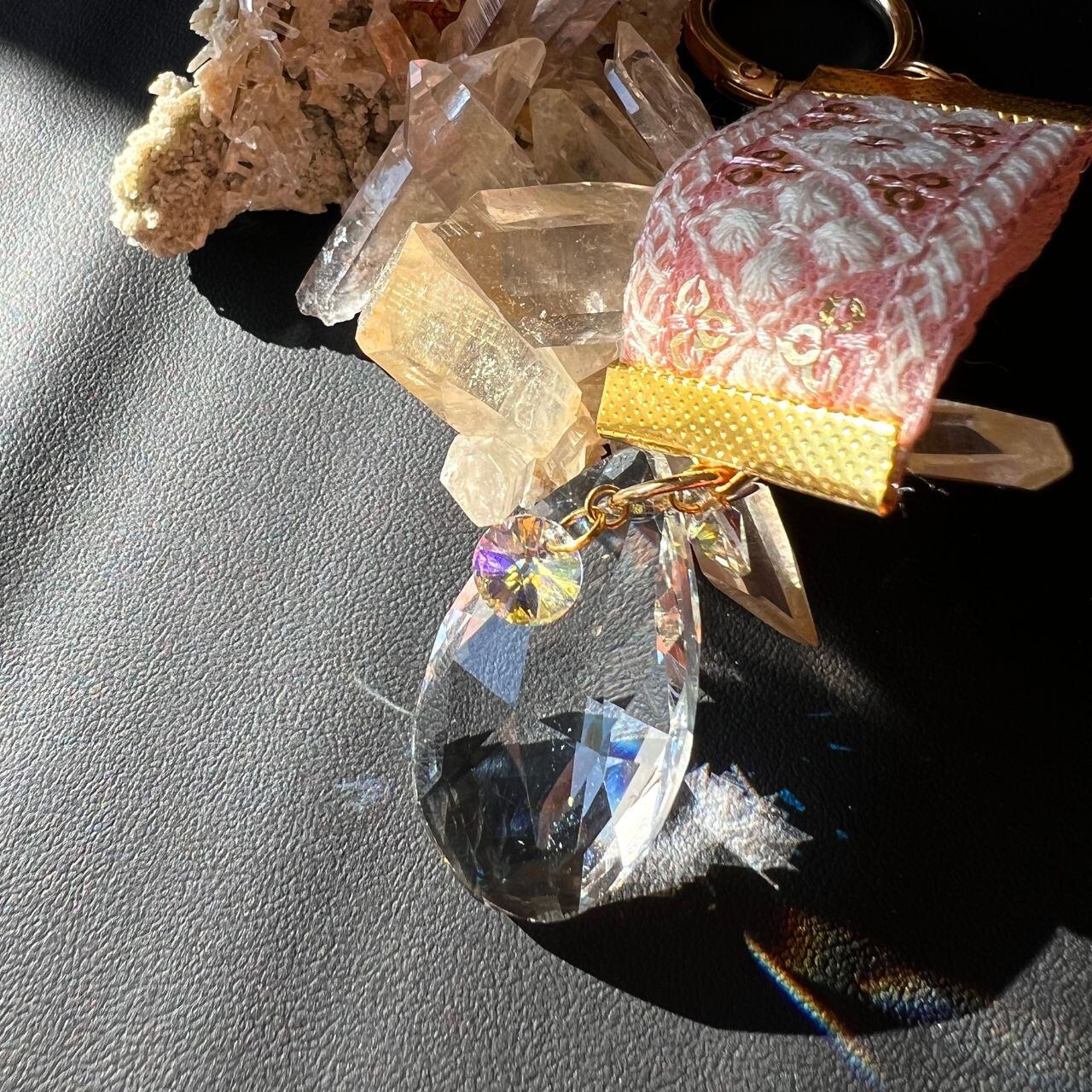 淡く広がるピーチピンクのインド刺繍と、しずく型サンキャッチャーが組み合わさり、「持ち歩ける光」として仕上げています。