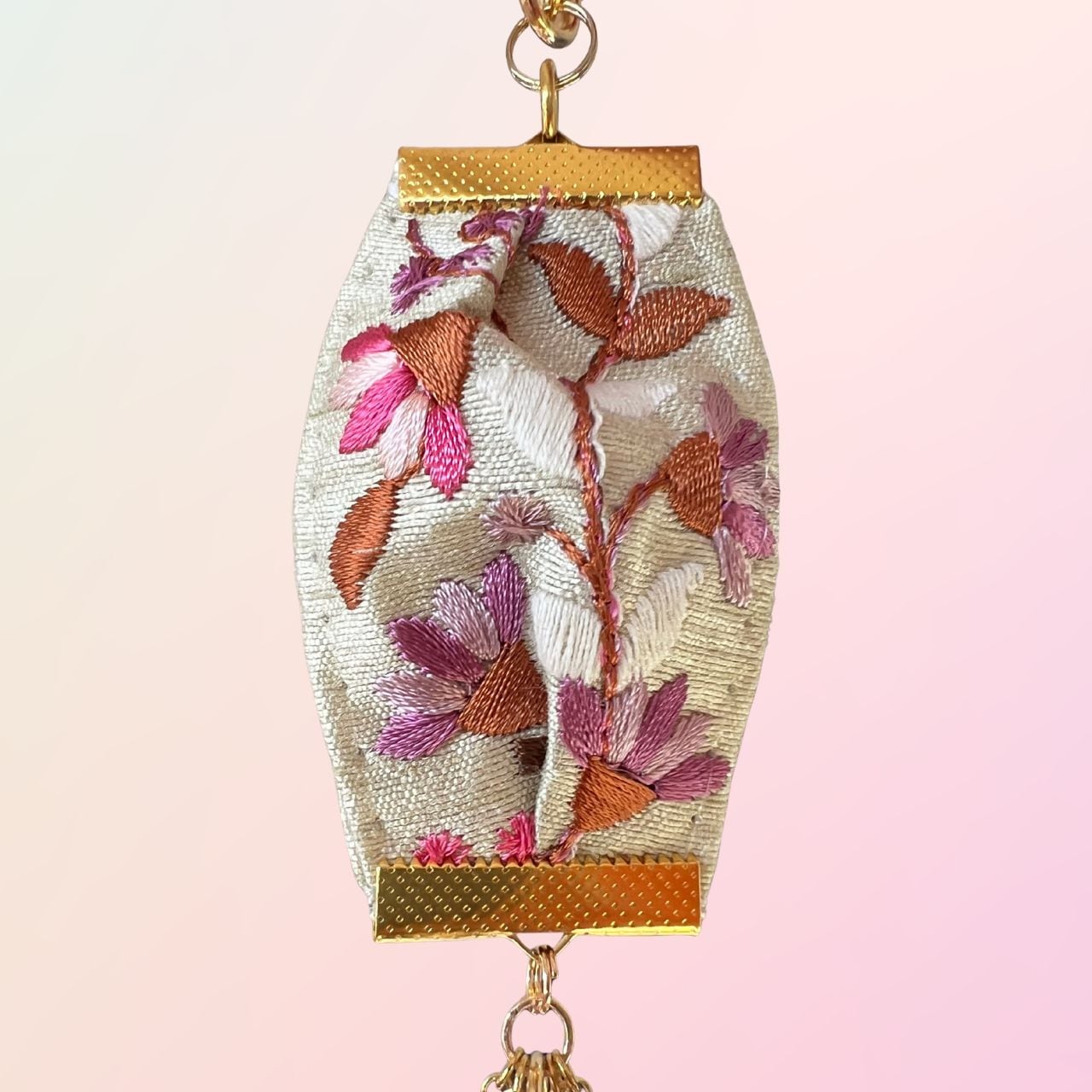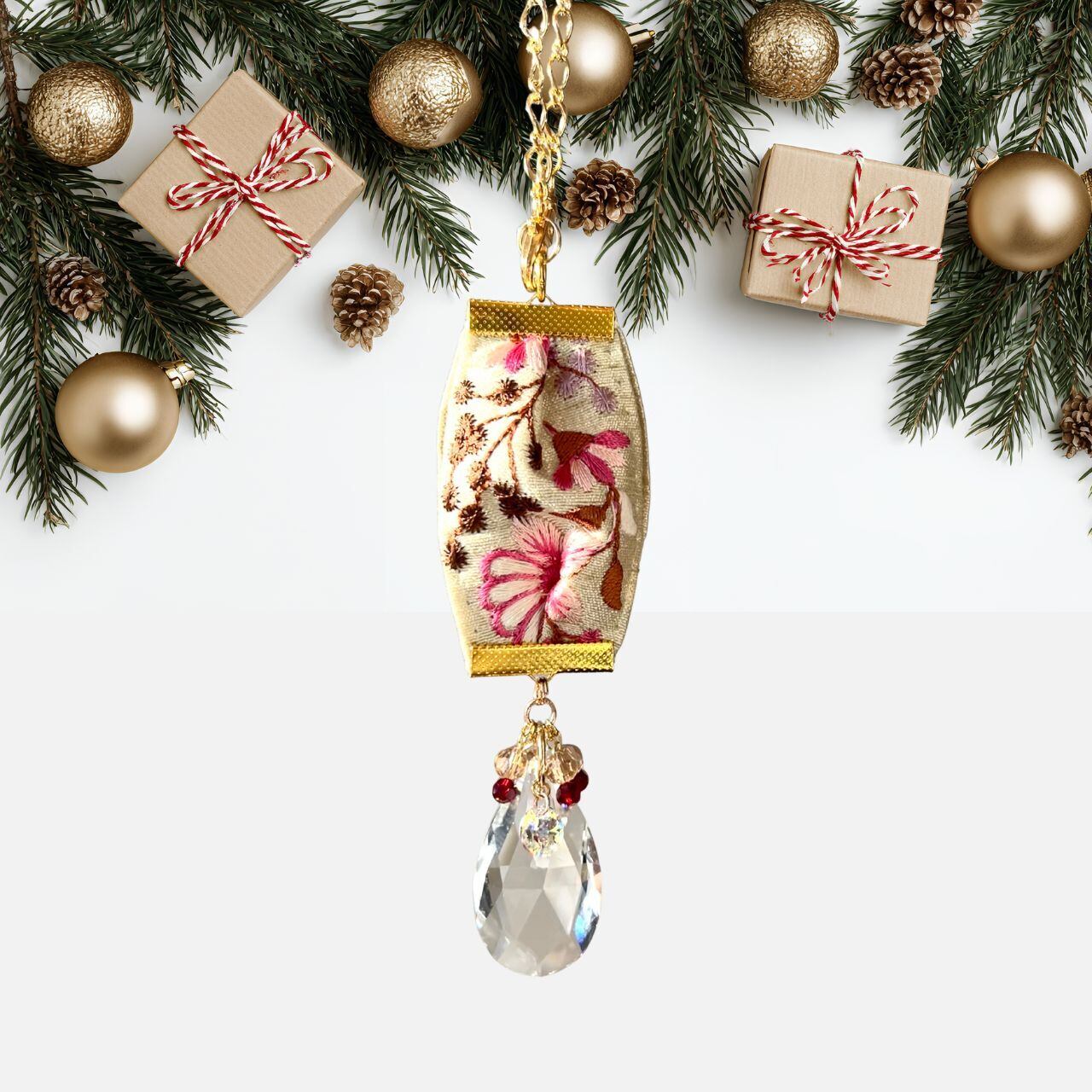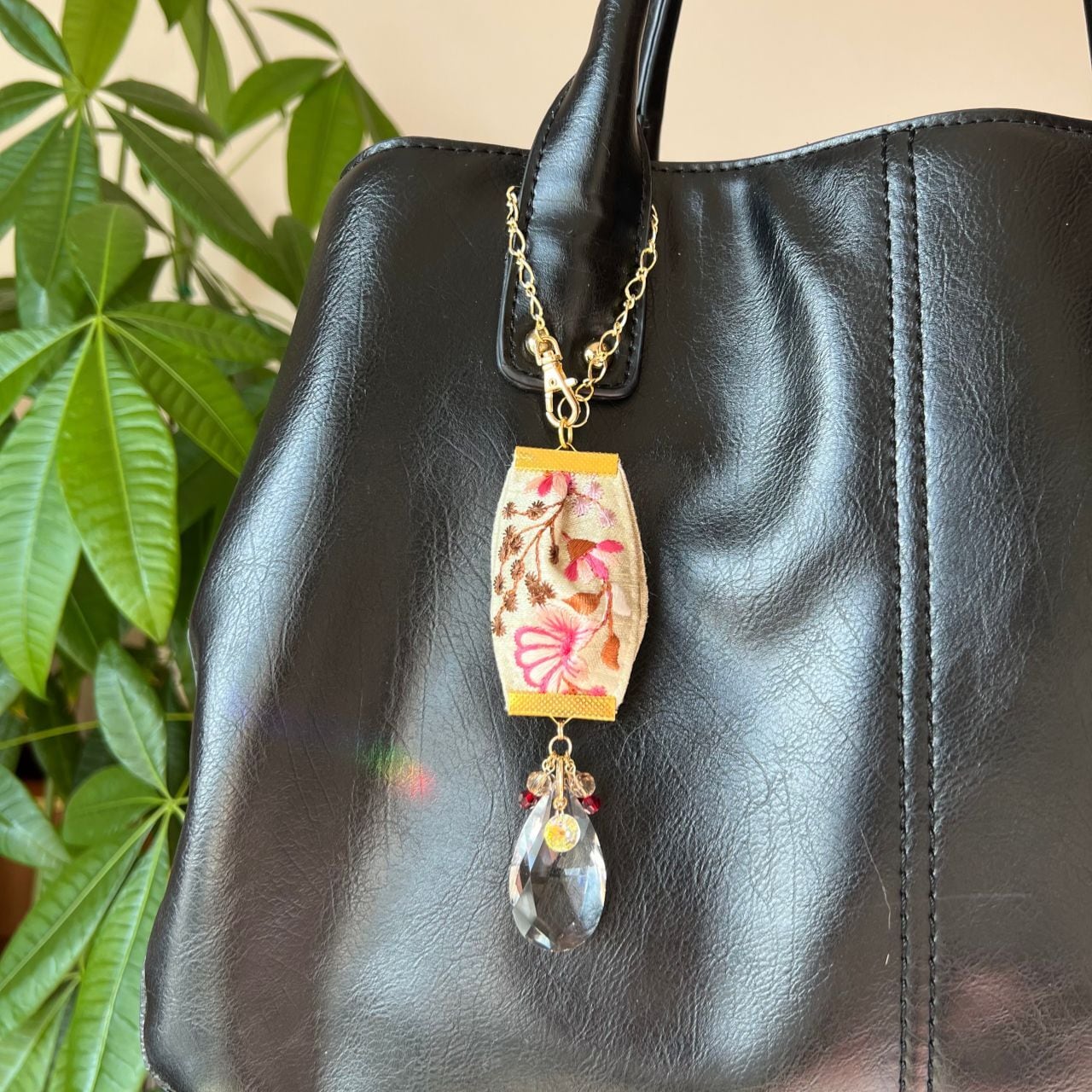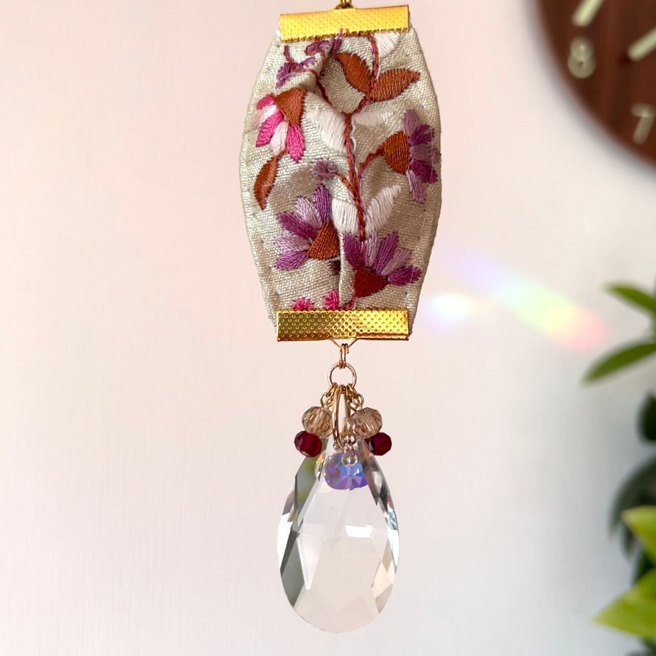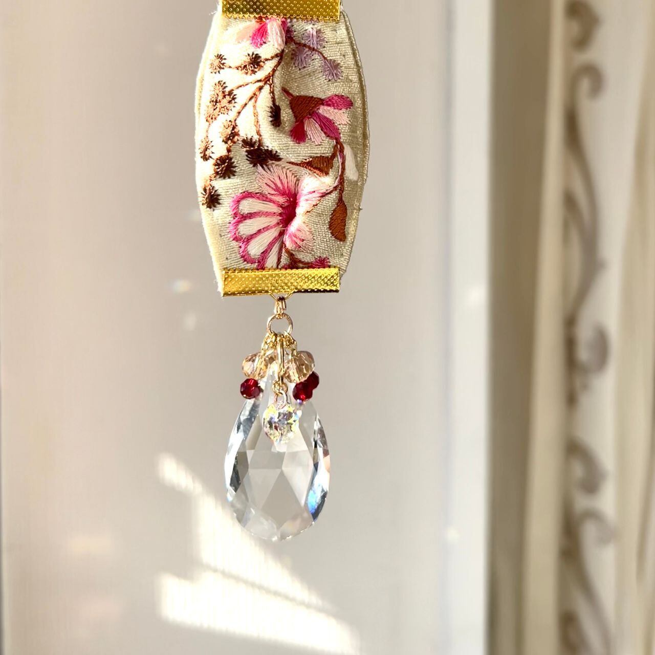 インド刺繍のリボンとしずく型クリスタルが組み合わさり、「持ち歩ける光」としてやさしい輝きを添えてくれます。