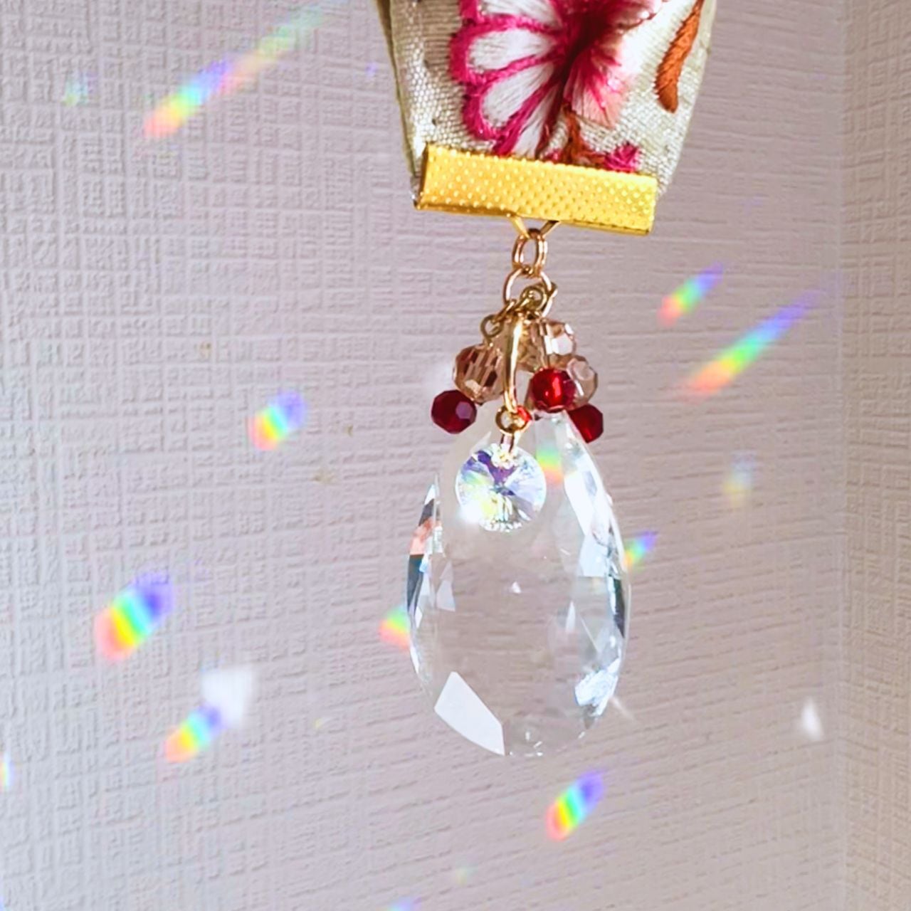 しずく型クリスタルが放つ虹のプリズムは、アクセサリーでありながらサンキャッチャー特有の浄化の役割もそのまま。