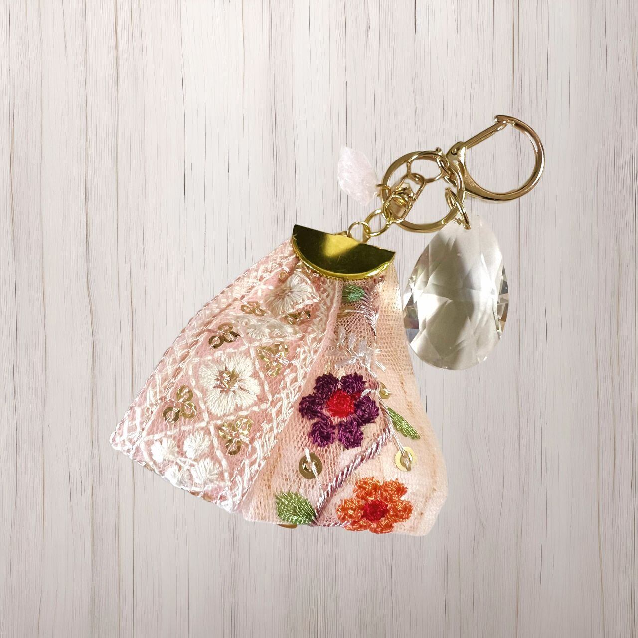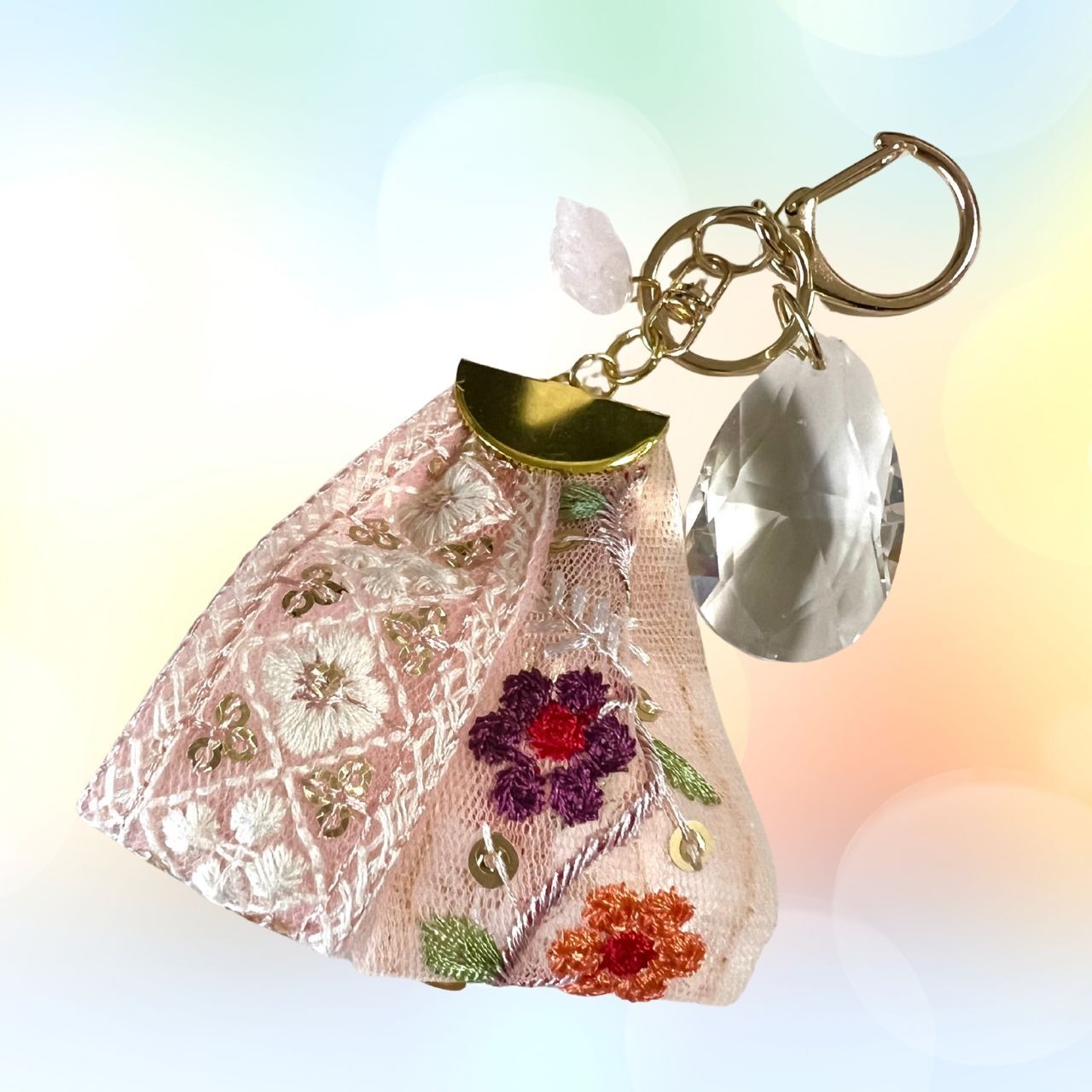 ・素材: 高品質クリスタルガラス、天然石(ローズクォーツ)、インド刺繍リボン、真鍮パーツ