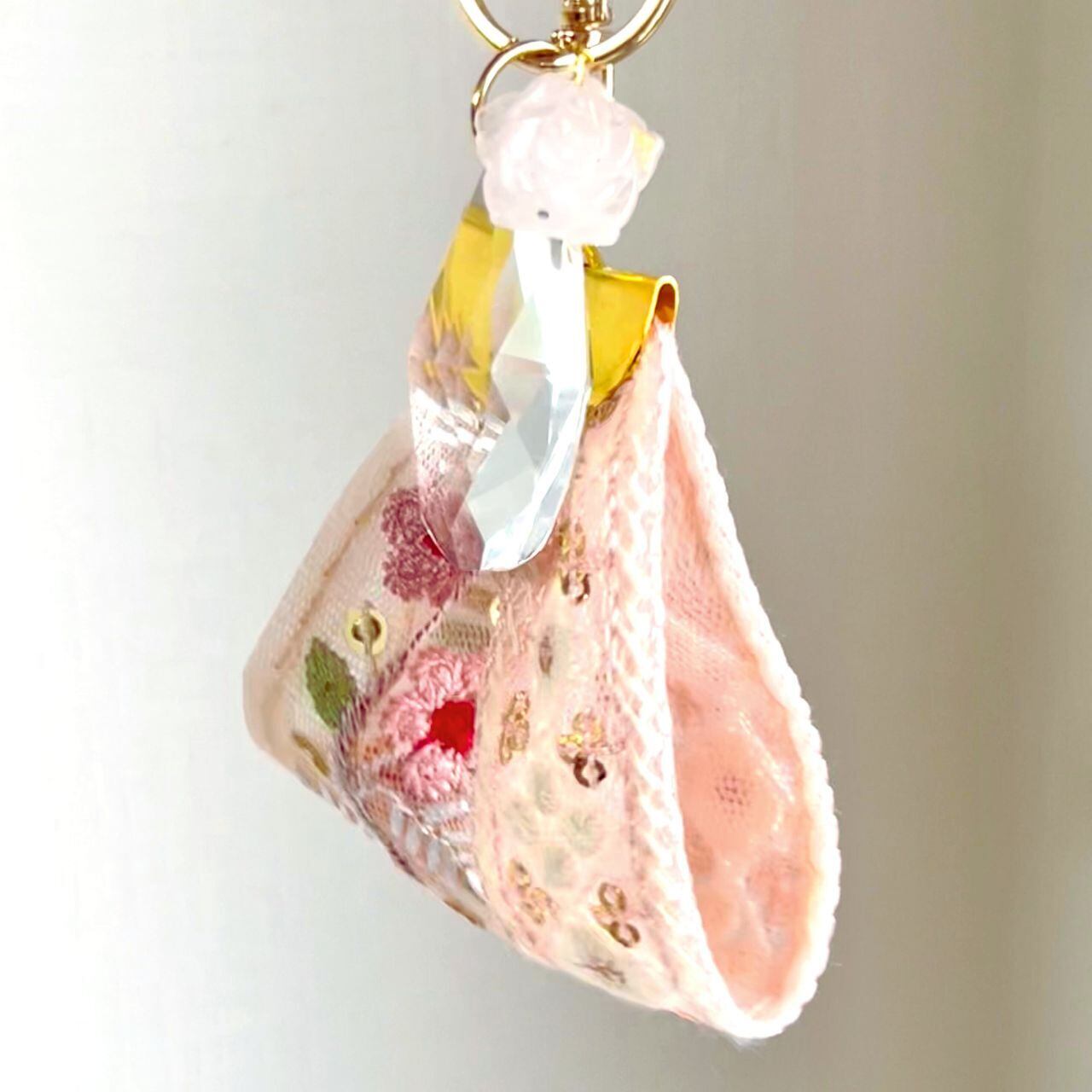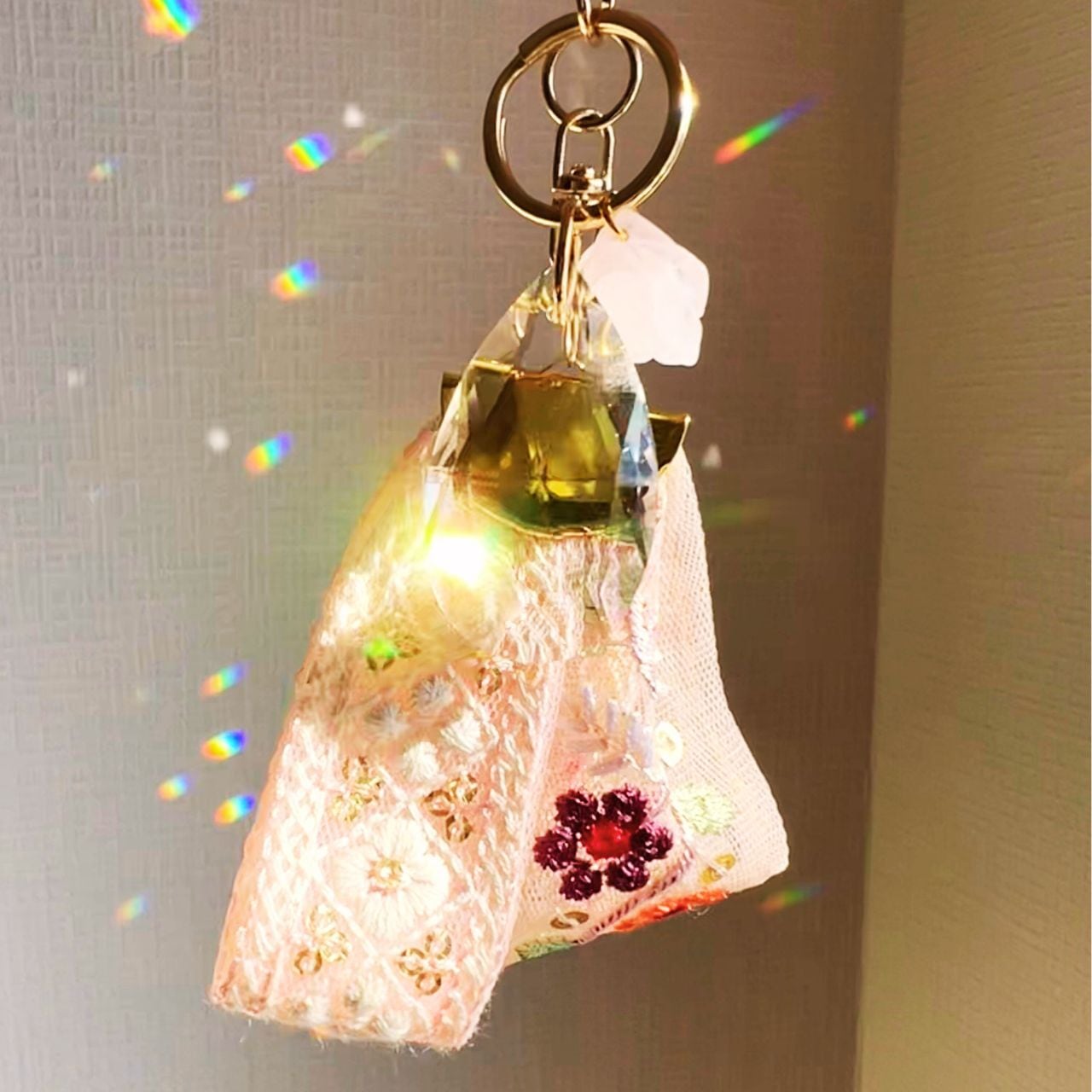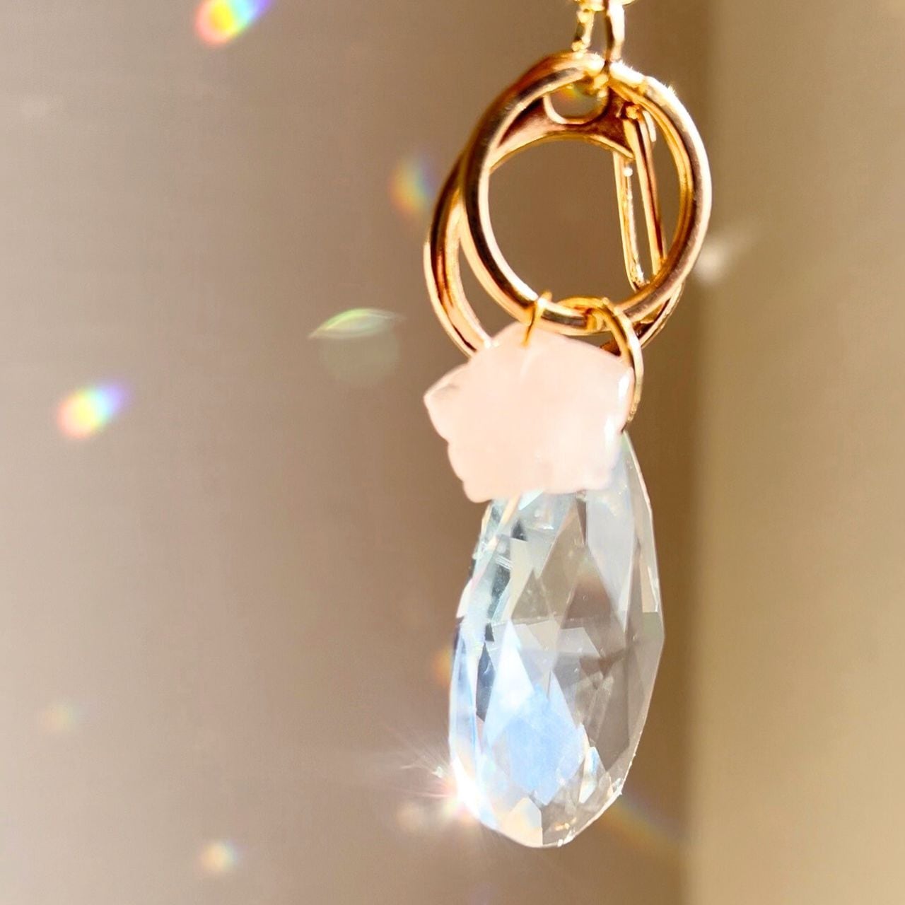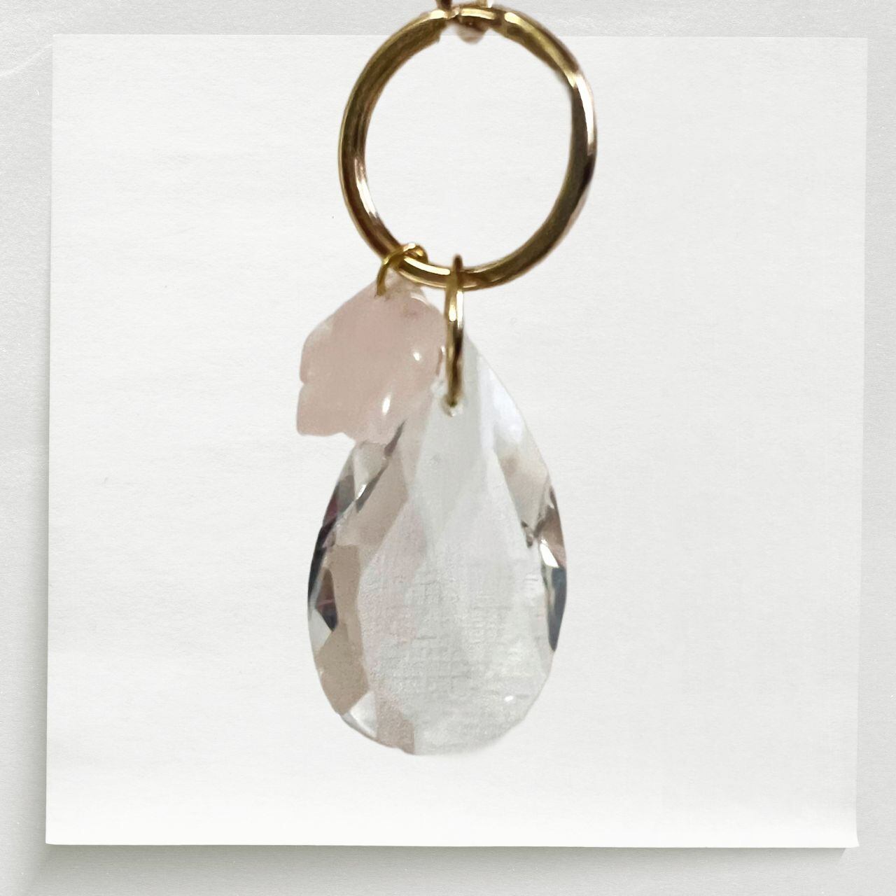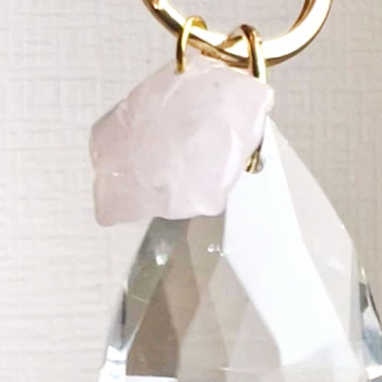 そこにしずく型のクリスタルと、バラを象った天然石のローズクォーツを添えています。「持ち歩ける光」として、あなたのバッグを美しく、そして心強く守ってくれます。