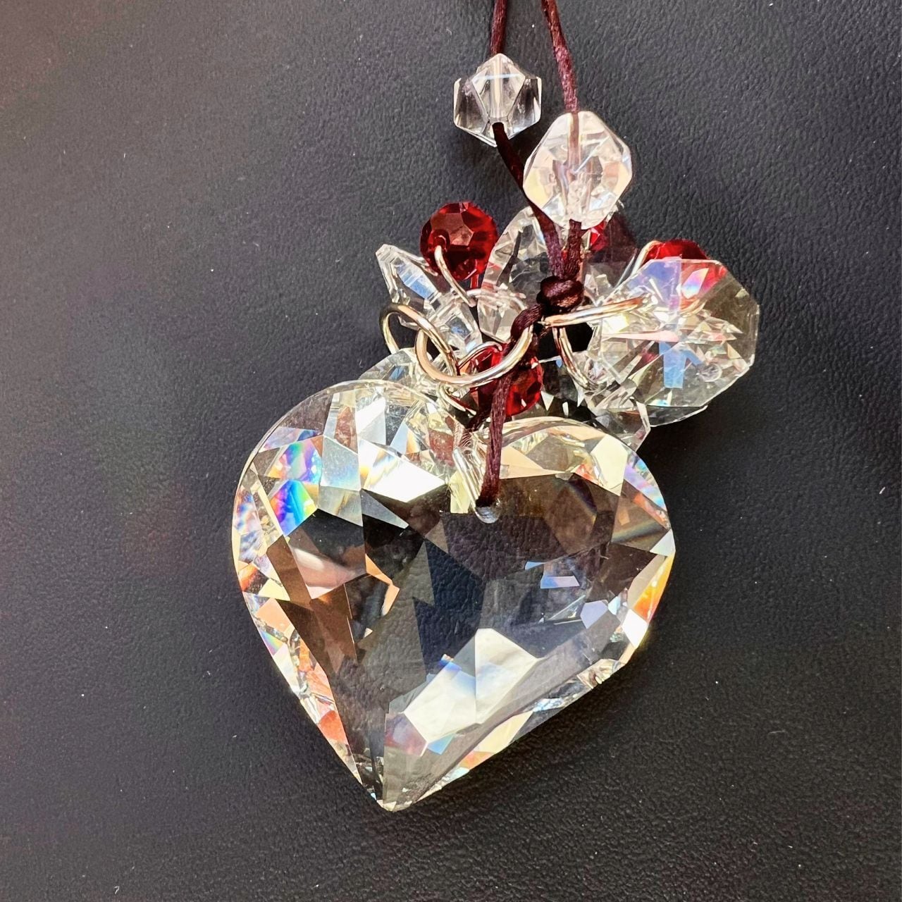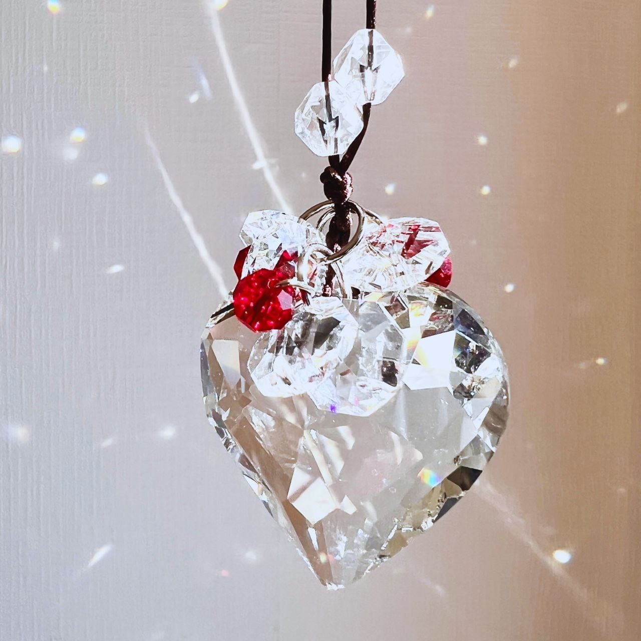 ◆ カラーセラピー / クリア・レッドのビーズとハート型クリスタルガラス、さらに20面カットの水晶を使用。