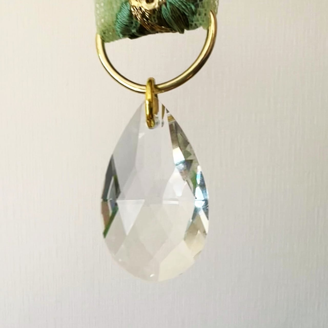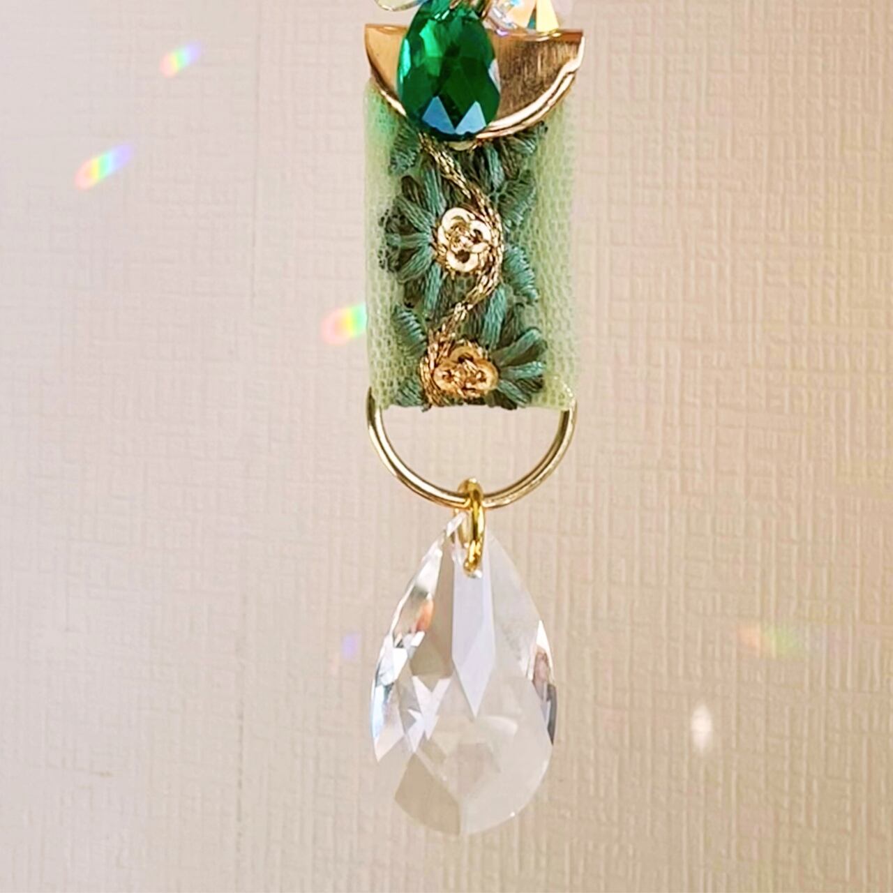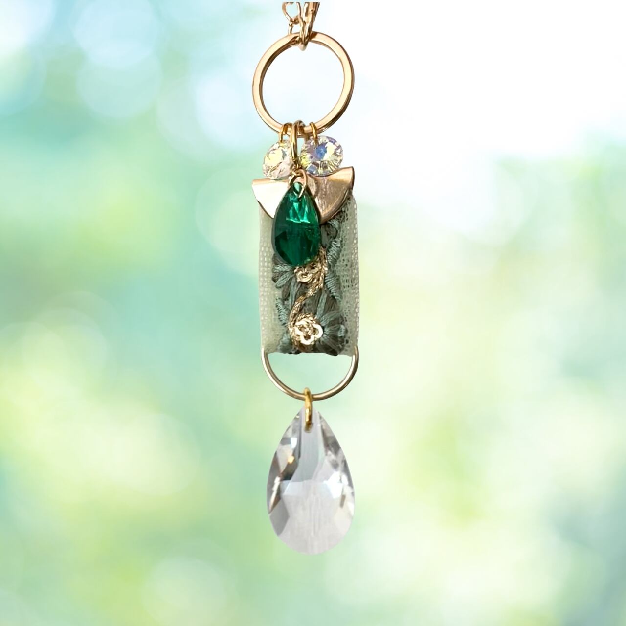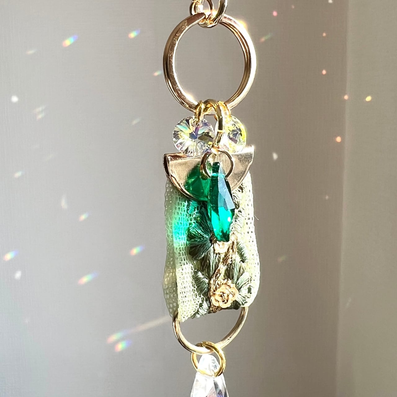 縦にスッと伸びるシャープなラインと、透明感あふれる刺繍の質感。そこにしずく型のサンキャッチャーが加わることで、まるで清らかな森の奥で、朝露が光を透過させているような静かな生命力を感じさせます。
