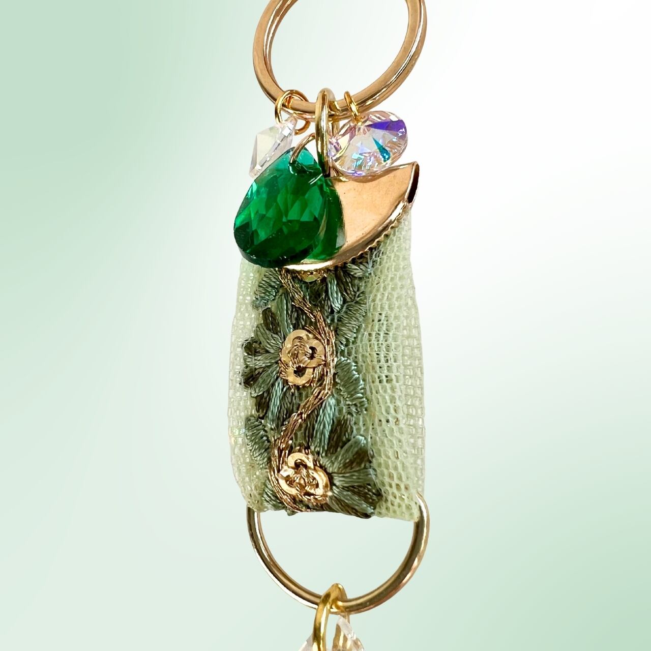 淡いミントグリーンの刺繍が柔らかな光を纏う中で、一滴の「エメラルド色のしずく」が全体を凛と引き締め、高貴な印象を醸し出します。
