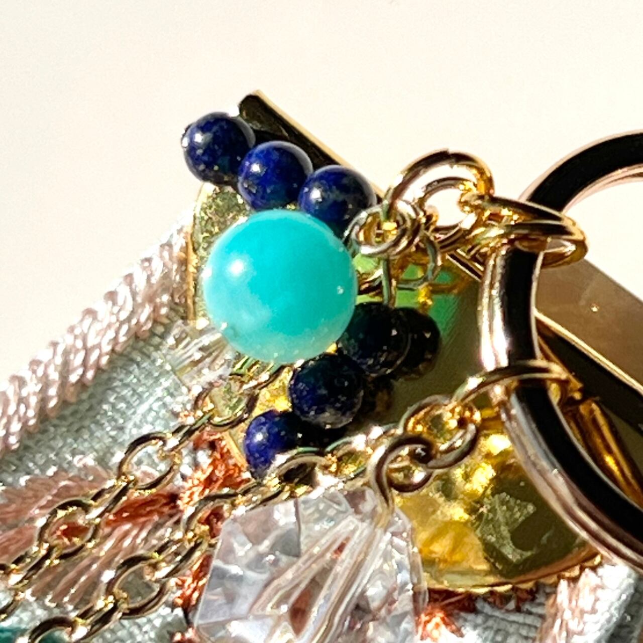 このチャームには、輝きだけでなく「自然のエネルギー」を取り入れるために、3種類の天然石を入れました。