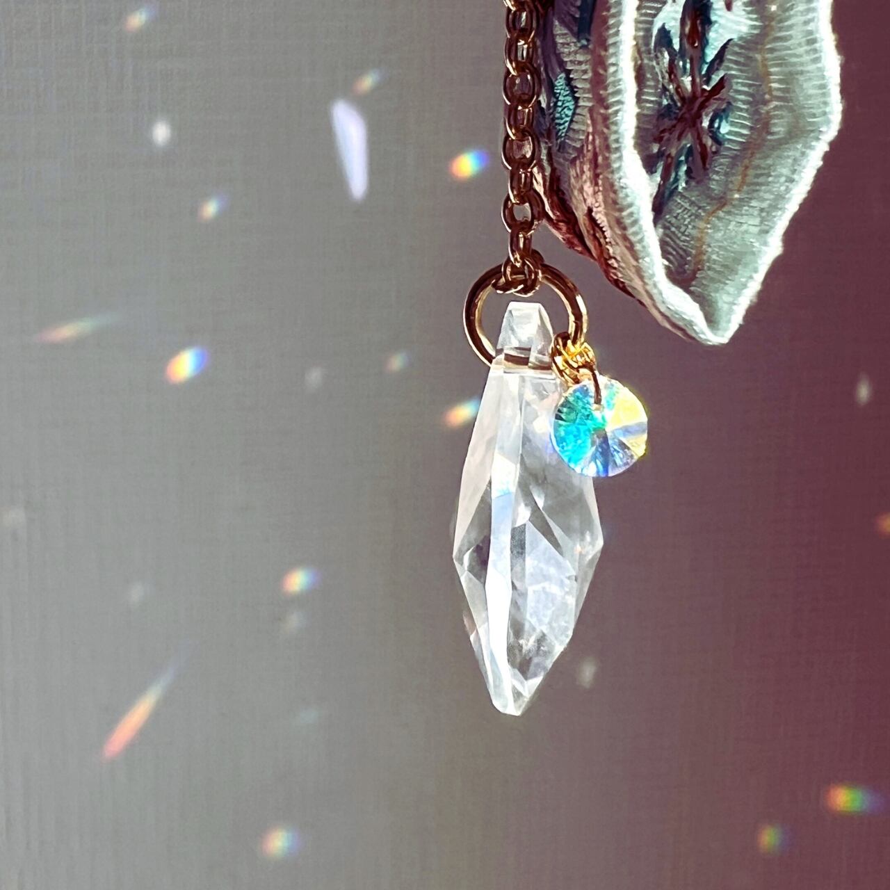 揺れるたびに光を集めるしずく型のサンキャッチャーと、そこに添えられた天然石が共鳴し、思考をクリアにし、澄んだ輝きを放ちます。