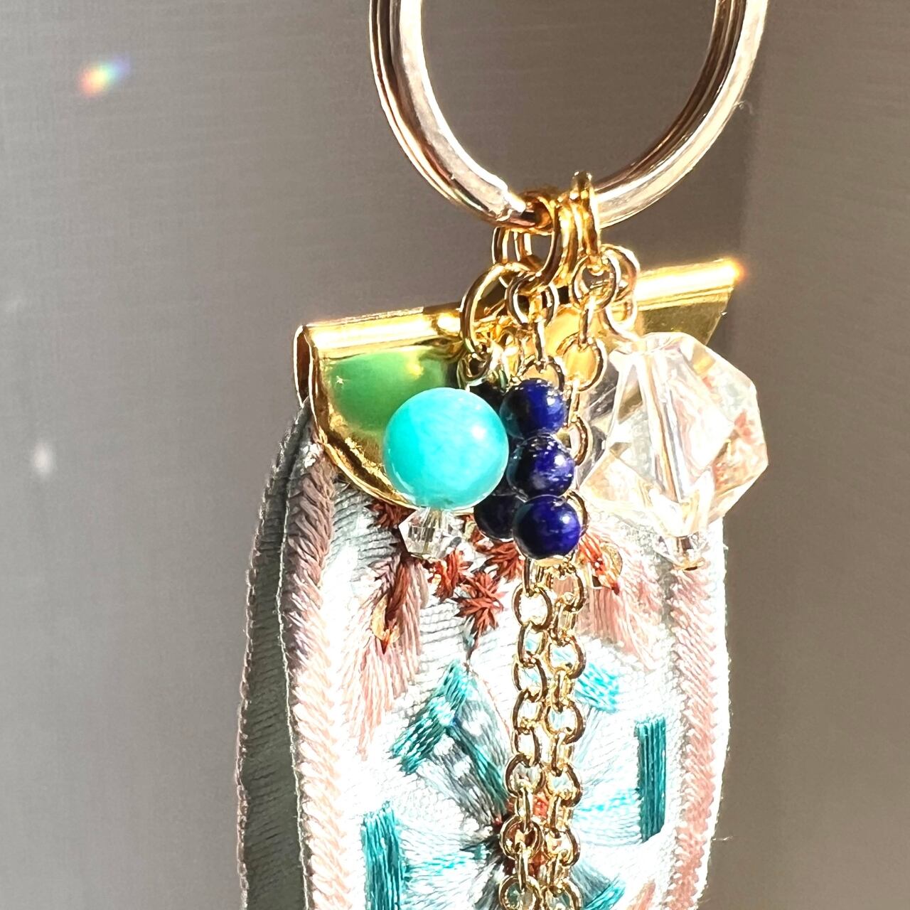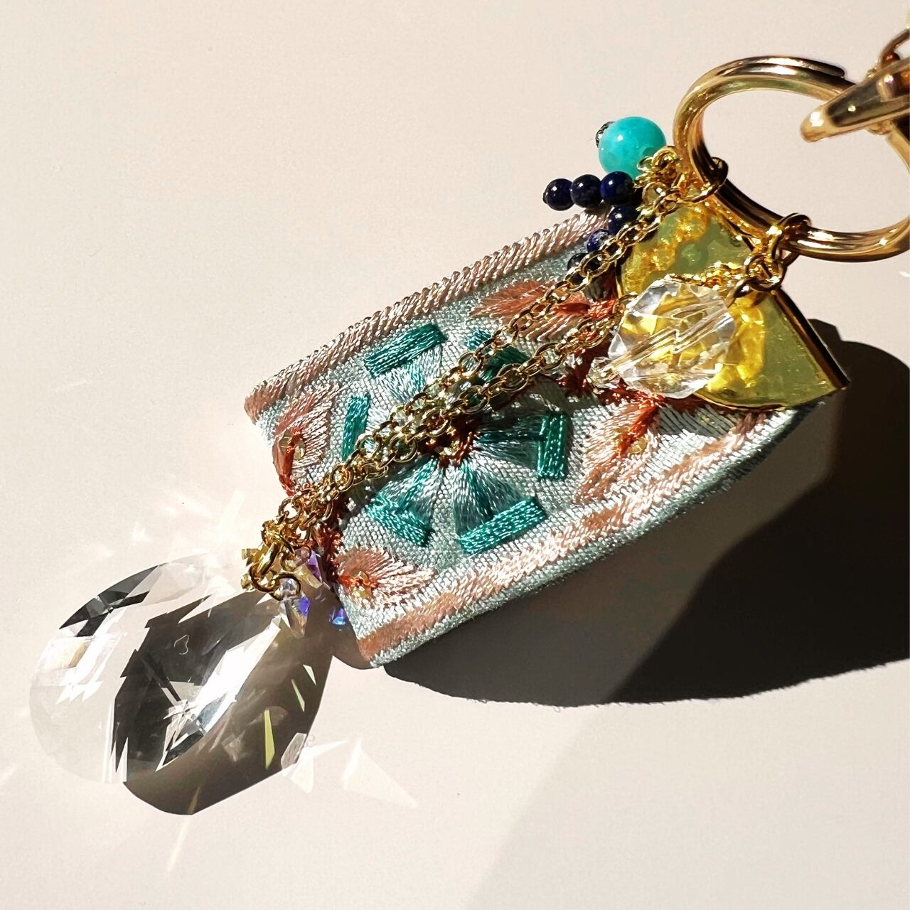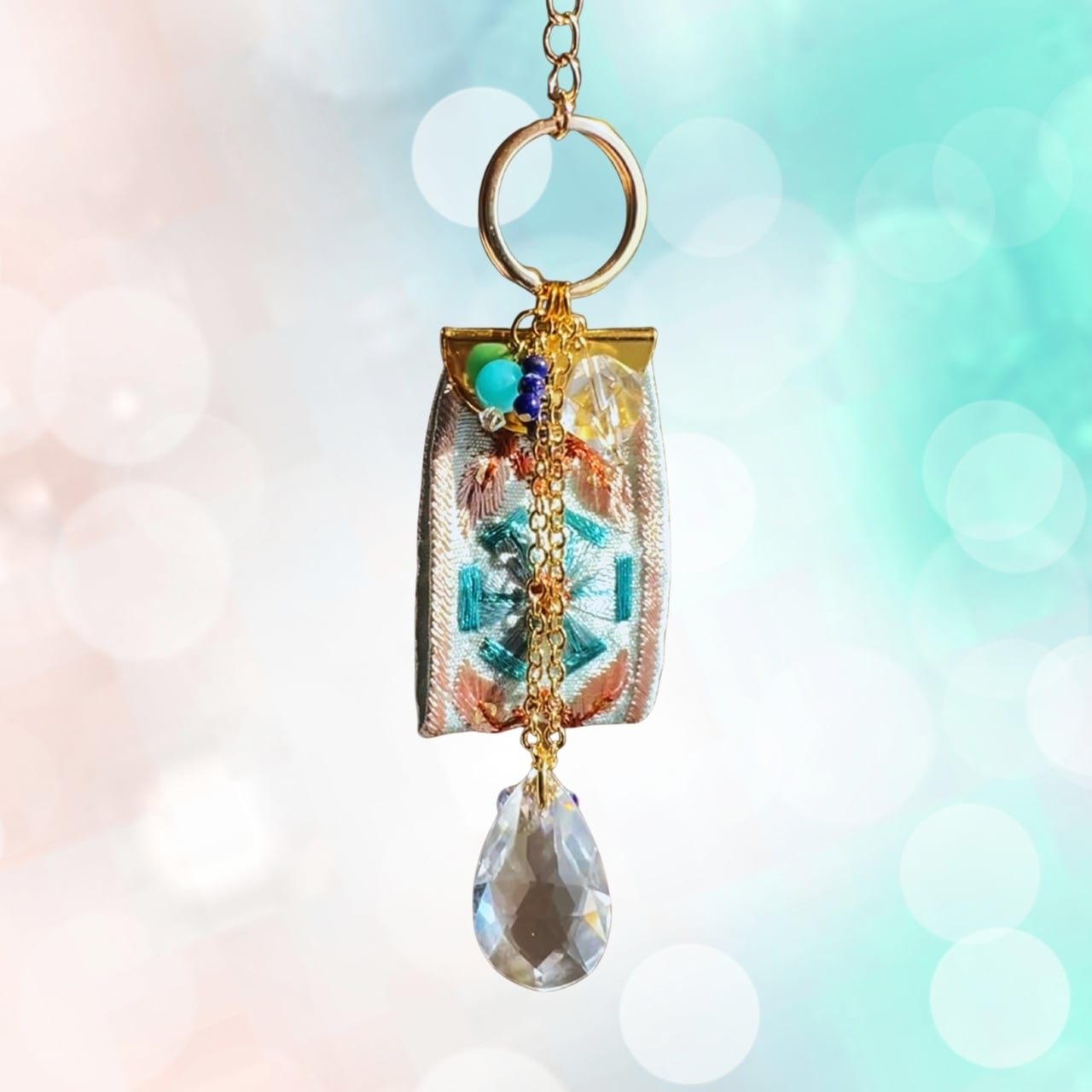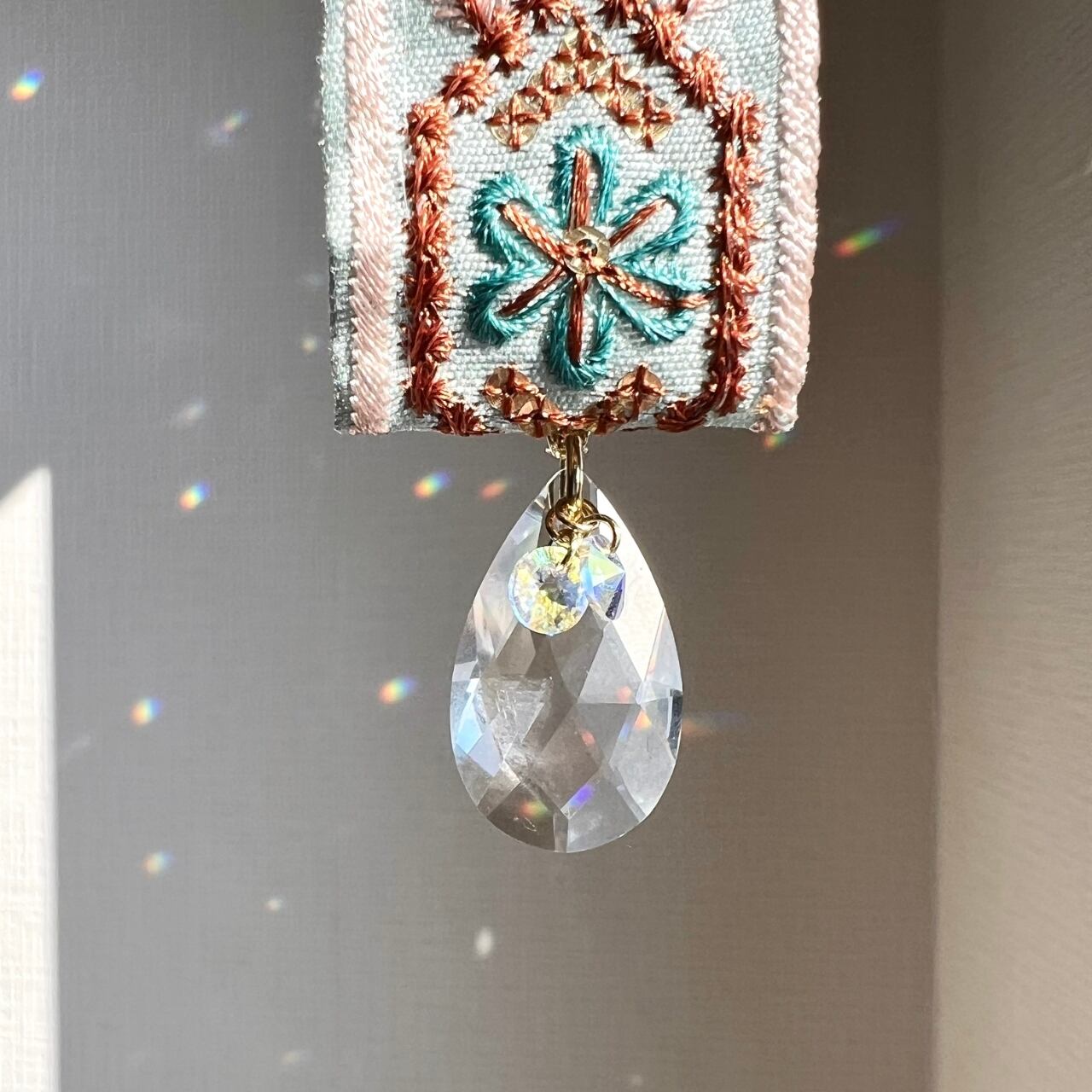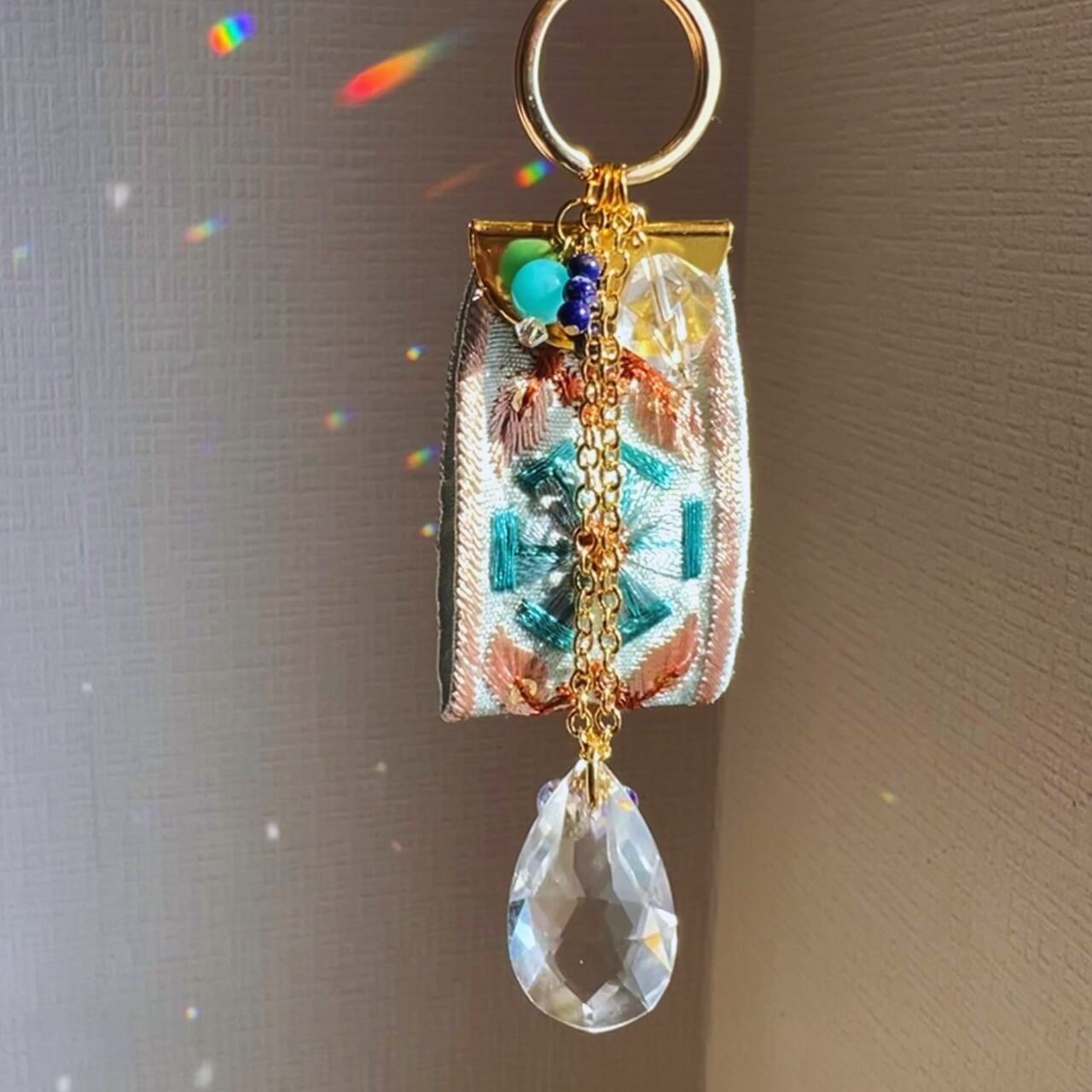 エンブロとは、一針一針に祈りを乗せるような刺繍(Embroidery)のこと。 織り重なる糸の艶やかな光沢、幾何学模様の緻密な美しさ、そして布地ならではの安らぐ手触り。サンキャッチャーの透明な輝きと融合し、持つ人の心に優しく寄り添うバッグチャームシリーズです。