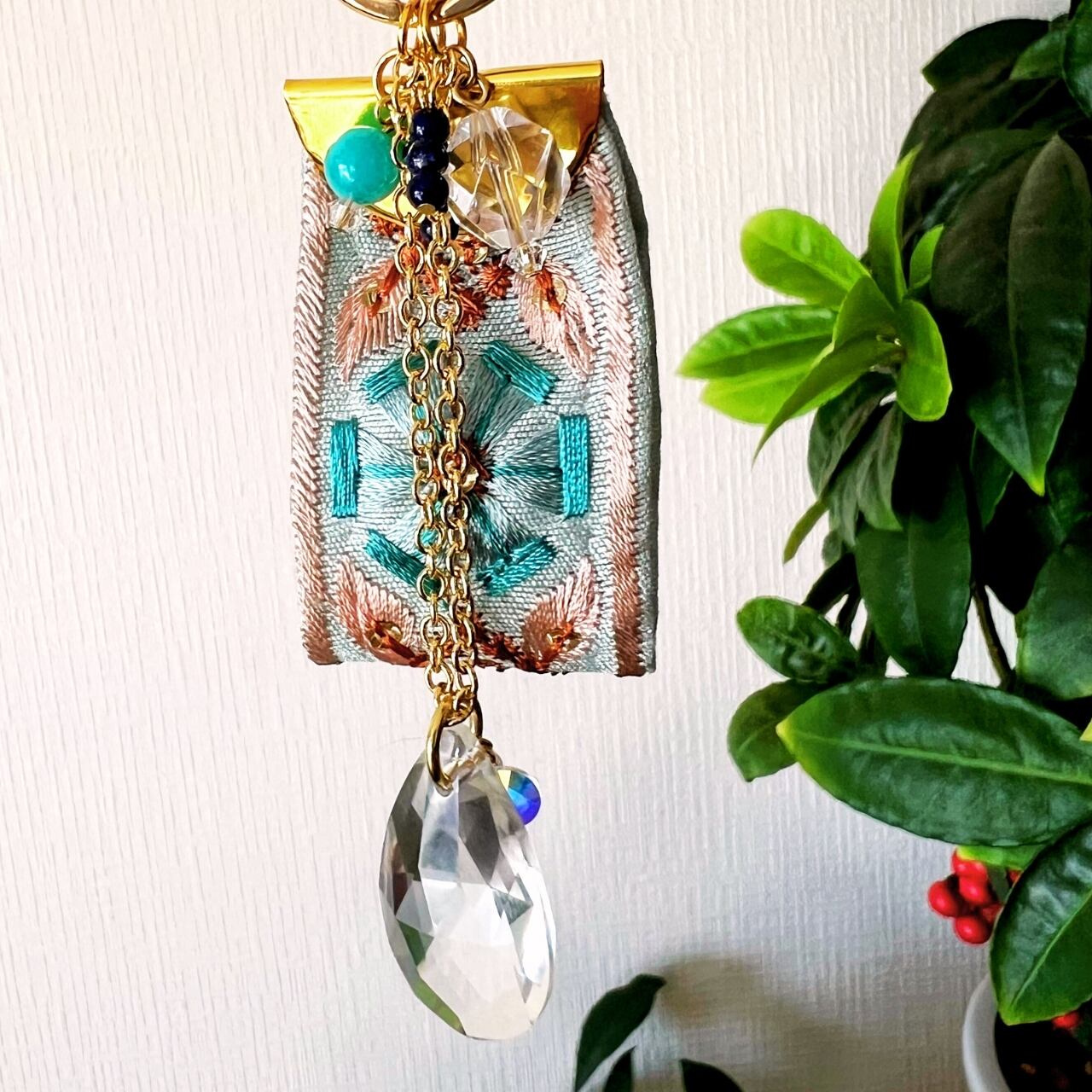 高品質クリスタルガラス、インド刺繍リボン、天然石(アマゾナイト、ラピスラズリ、水晶)を使用。