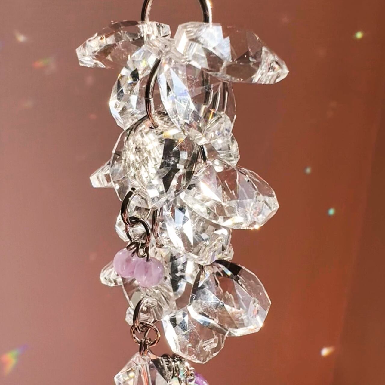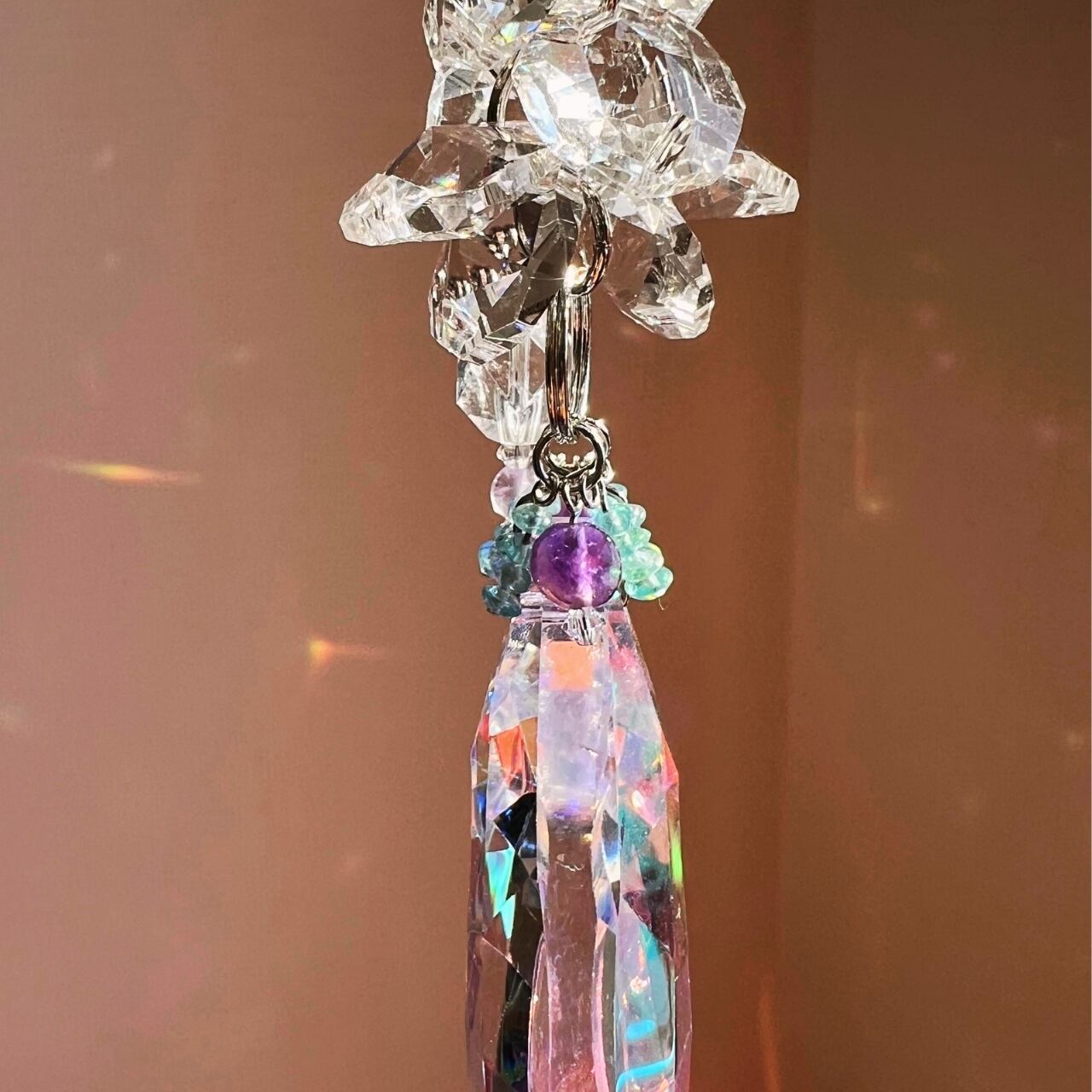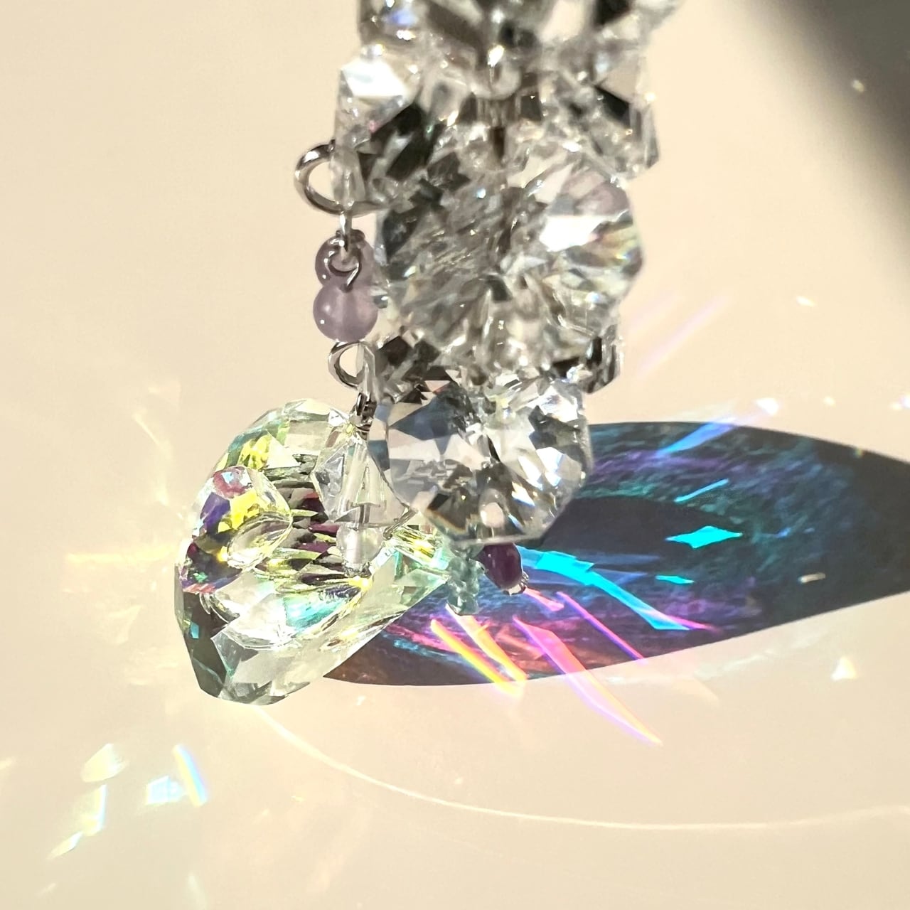 オーロラ加工されたクリスタルガラスとクリアビーズが幾重にも重なり合い、まるで湧き上がる泉のように光を放つサンキャッチャーです。