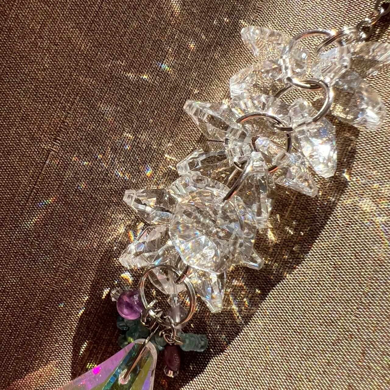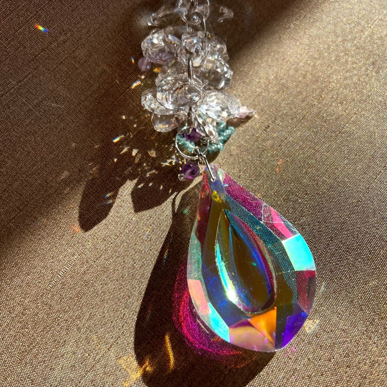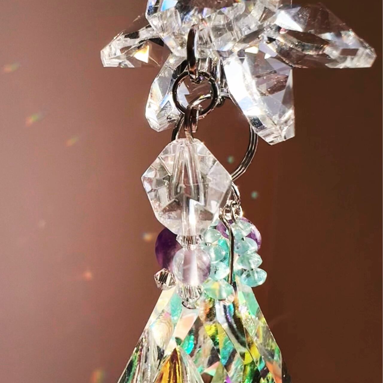 オーロラ加工されたクリスタルガラスとクリアビーズが幾重にも重なり合い、まるで湧き上がる泉のように光を放つサンキャッチャーです。