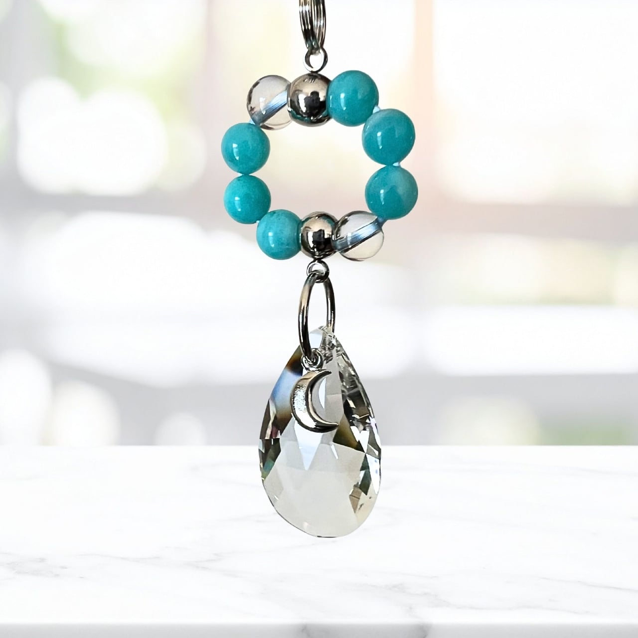 見上げる空のように明るく鮮やかな水色のアマゾナイトと、透明感あふれる水晶を繋ぎ合わせたリングに、クリスタルガラスのしずくを合わせました。