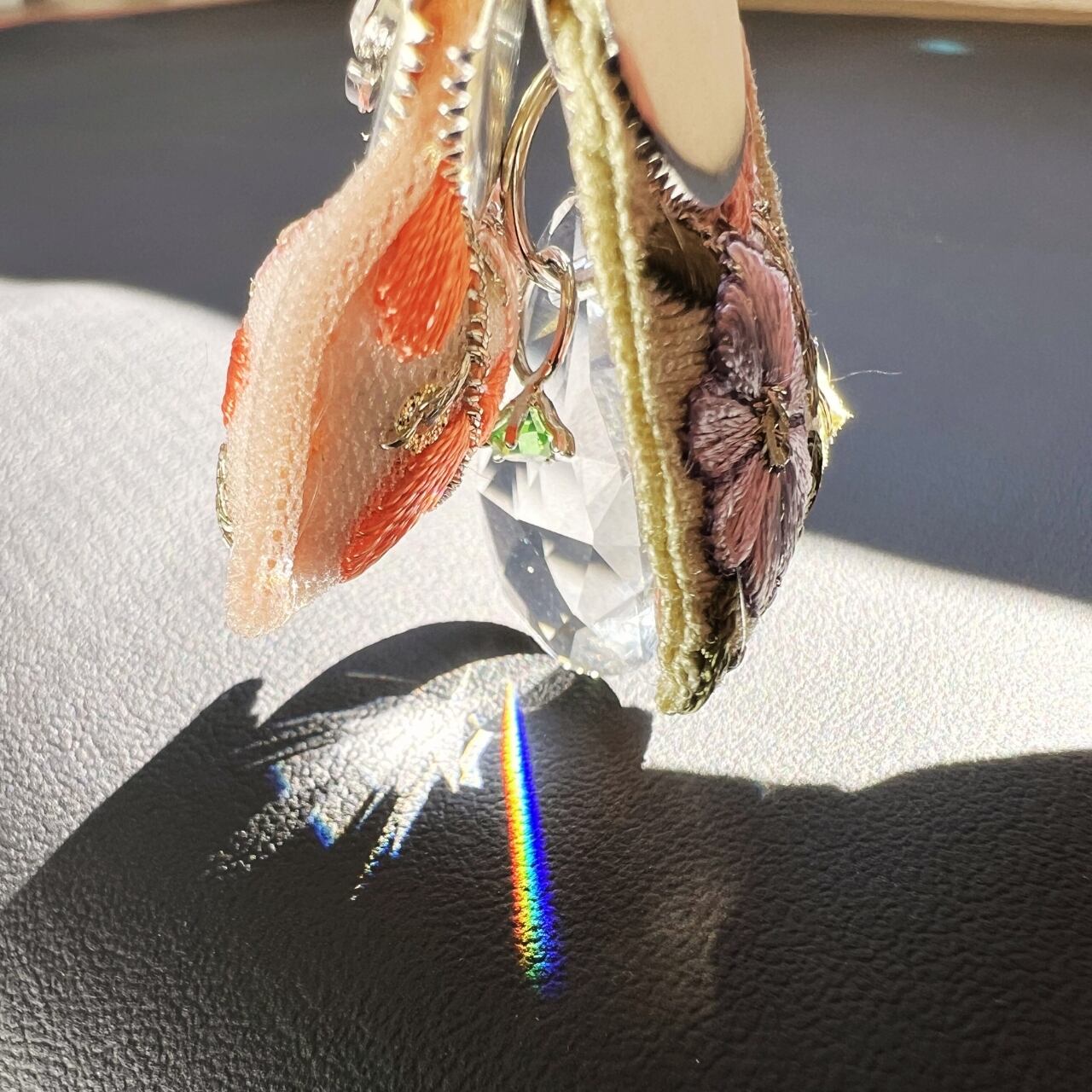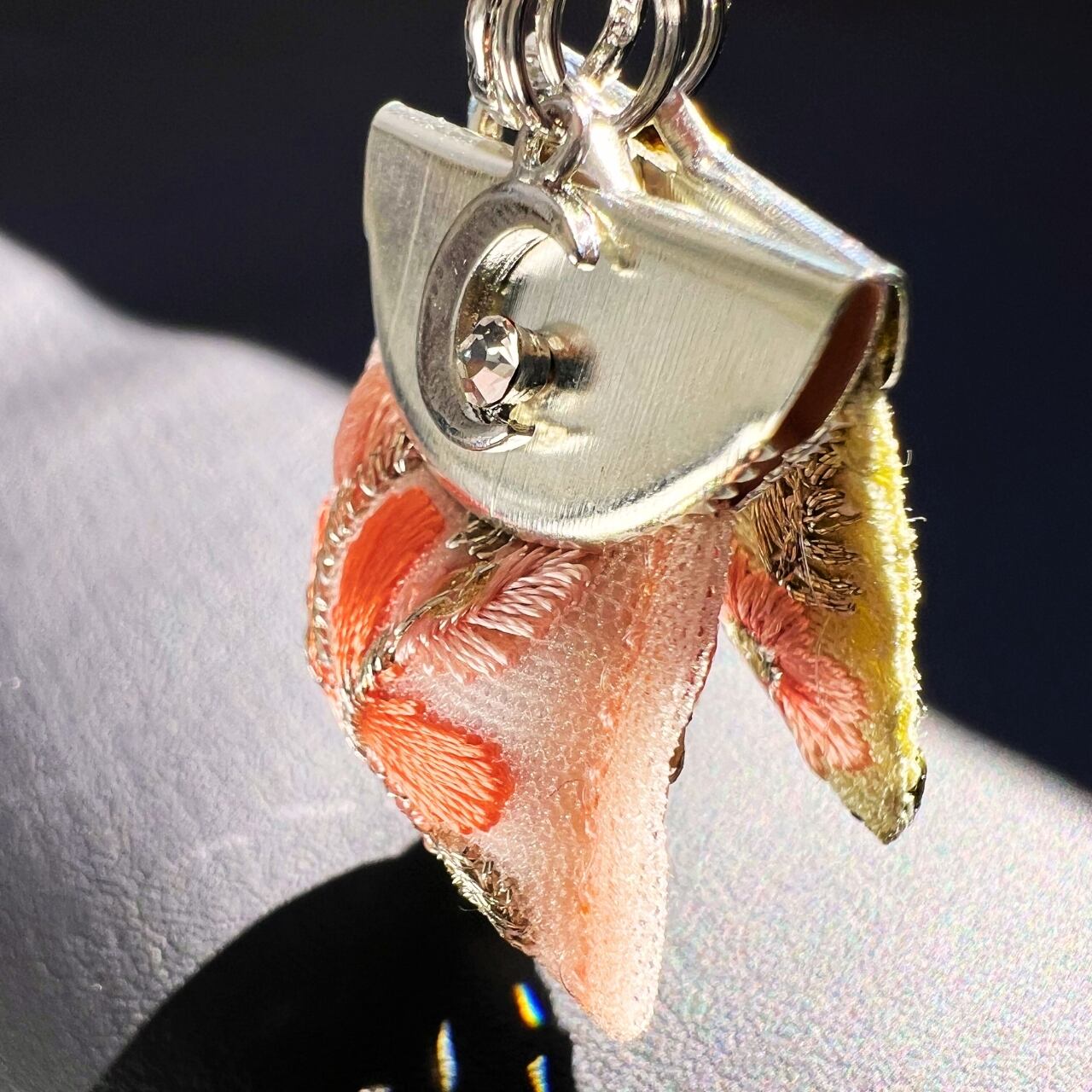 芽吹いたばかりの若草のような淡い緑色と淡いピンクのインド刺繍リボンに、オレンジやピンクや紫色の温かな花々が咲く様子は、まるで春の陽だまりをそのまま束ねたようなイメージです。