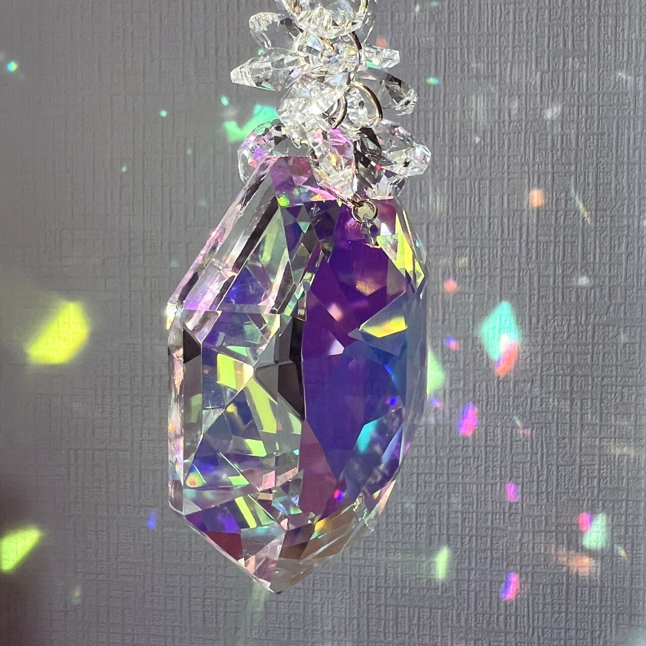 八角形の大きなクリスタルに、オーロラコーティングの光が重なり合うサンキャッチャーです。 角度がわずかに変わるだけで色が移ろい、まるで空気の層そのものに光が染み込んでいくような、美しく静かな変化を生み出します。