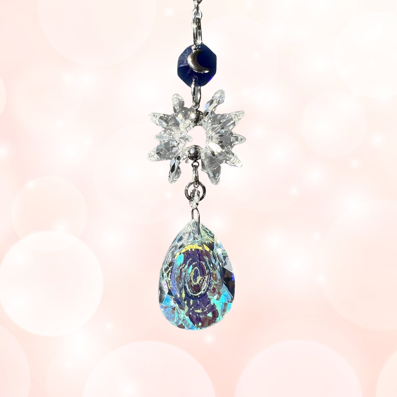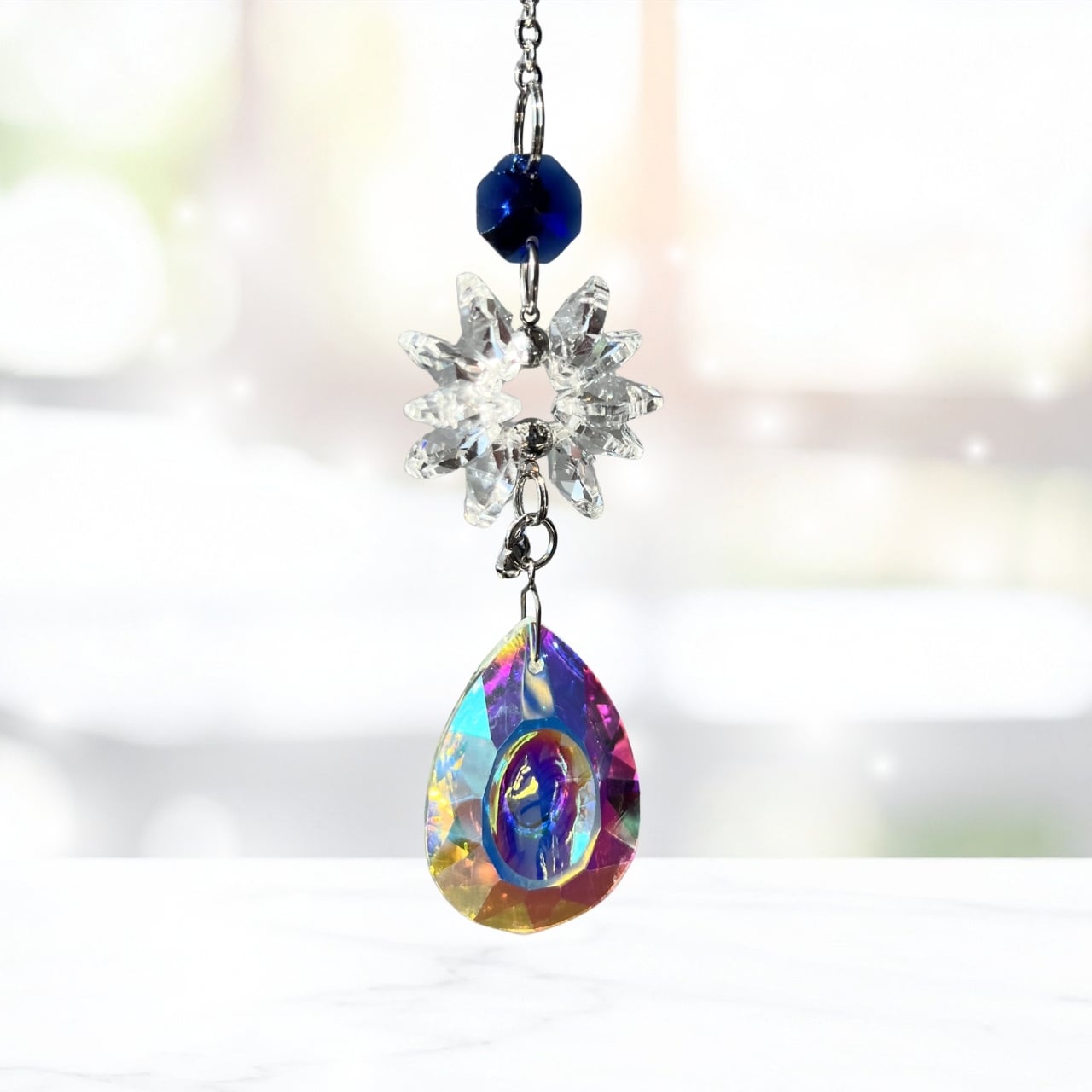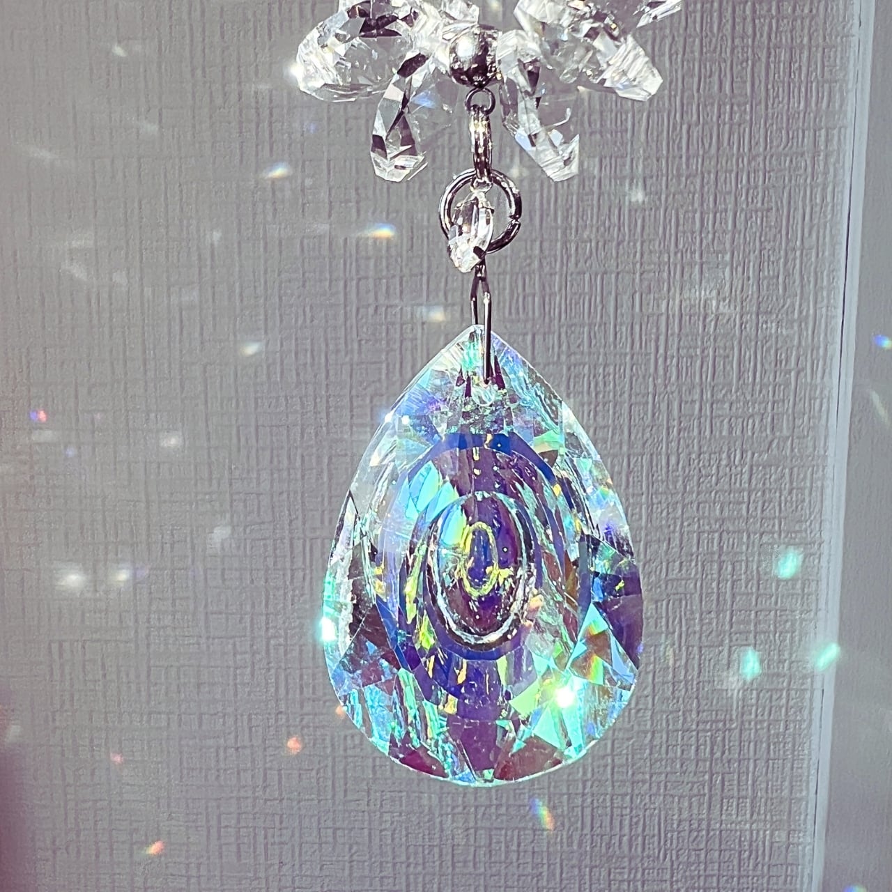オーロラ加工が施されたしずく型のクリスタルガラスと、緻密に組まれたクリアビーズが光を反射し、まるで輝く宝石のように空間を彩るサンキャッチャーです。