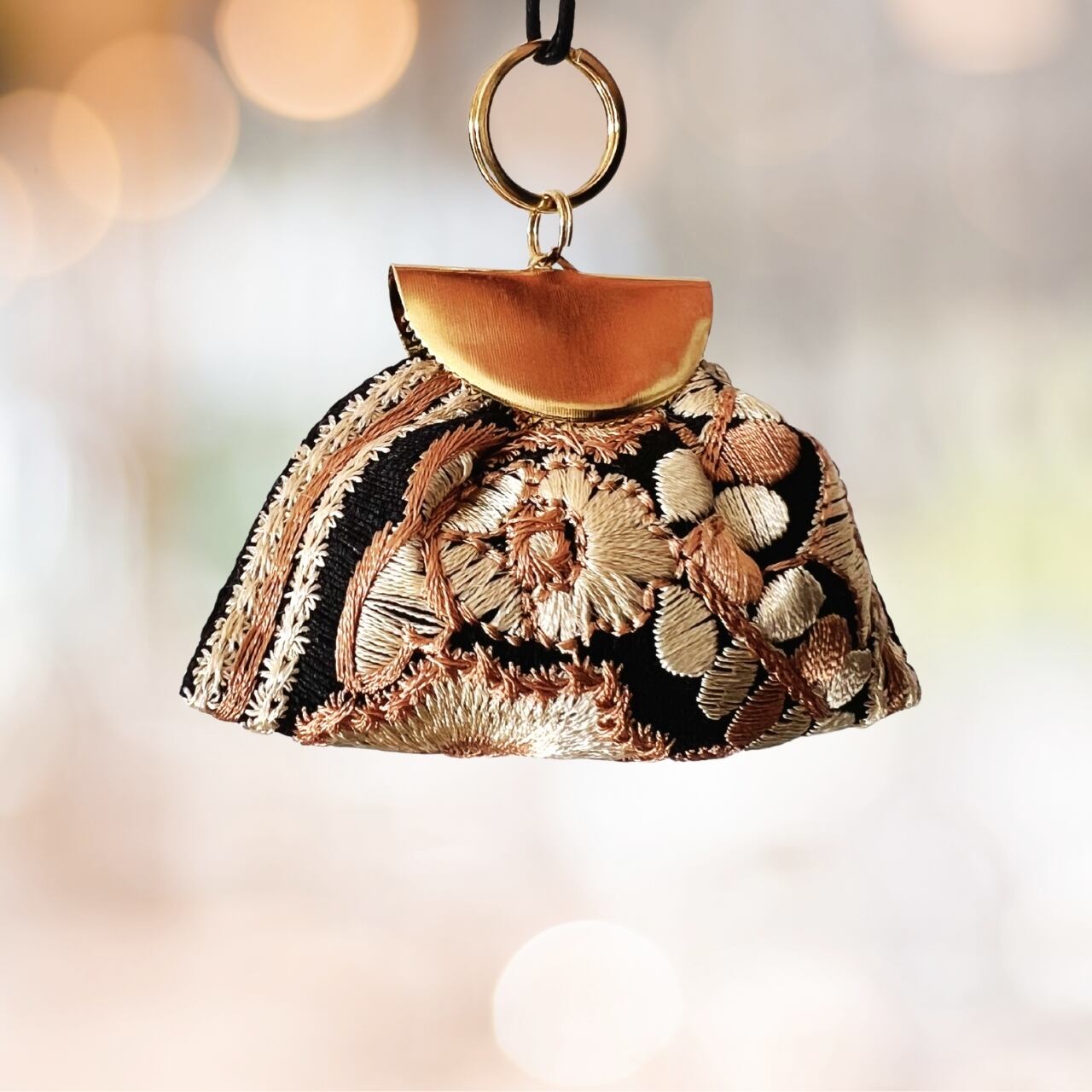 漆黒に映える、金とブロンズの緻密な刺繍を主役に、重厚感のある金の半月を添えて仕立てました。