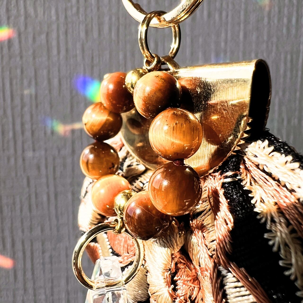 天然石のタイガーアイをリング状に組み合わせ、金のチャームの下で揺れるしずくタイプのサンキャッチャーが、周囲を力強い光と虹で満たしてくれます。