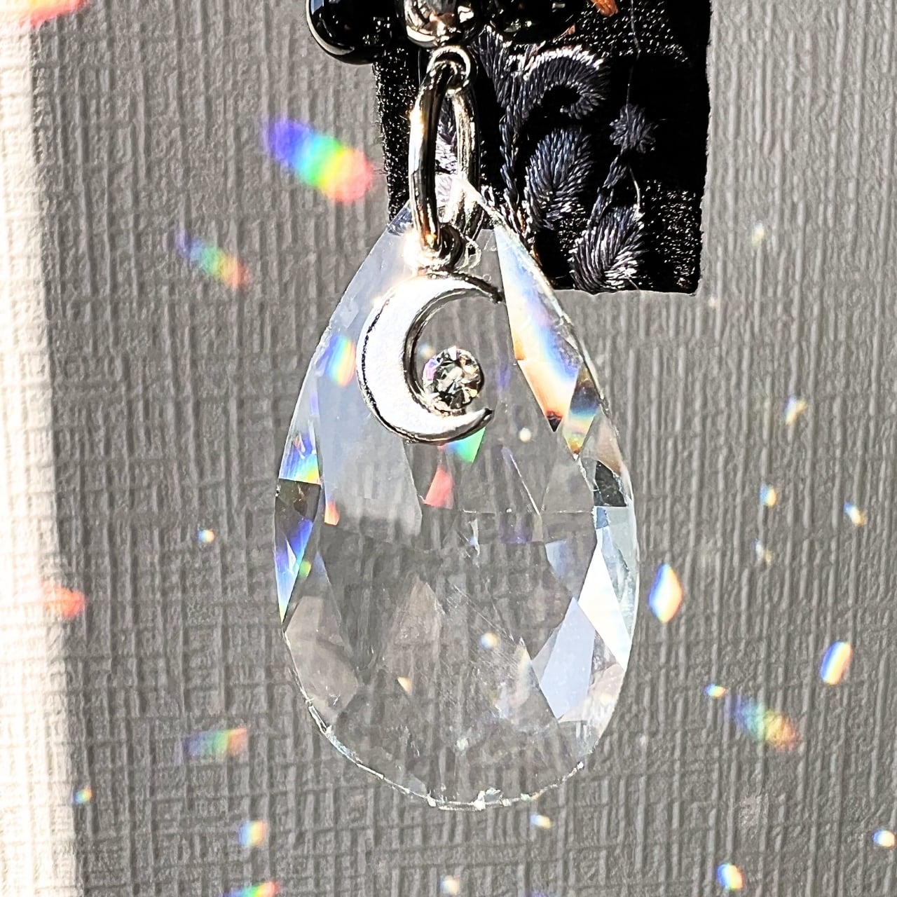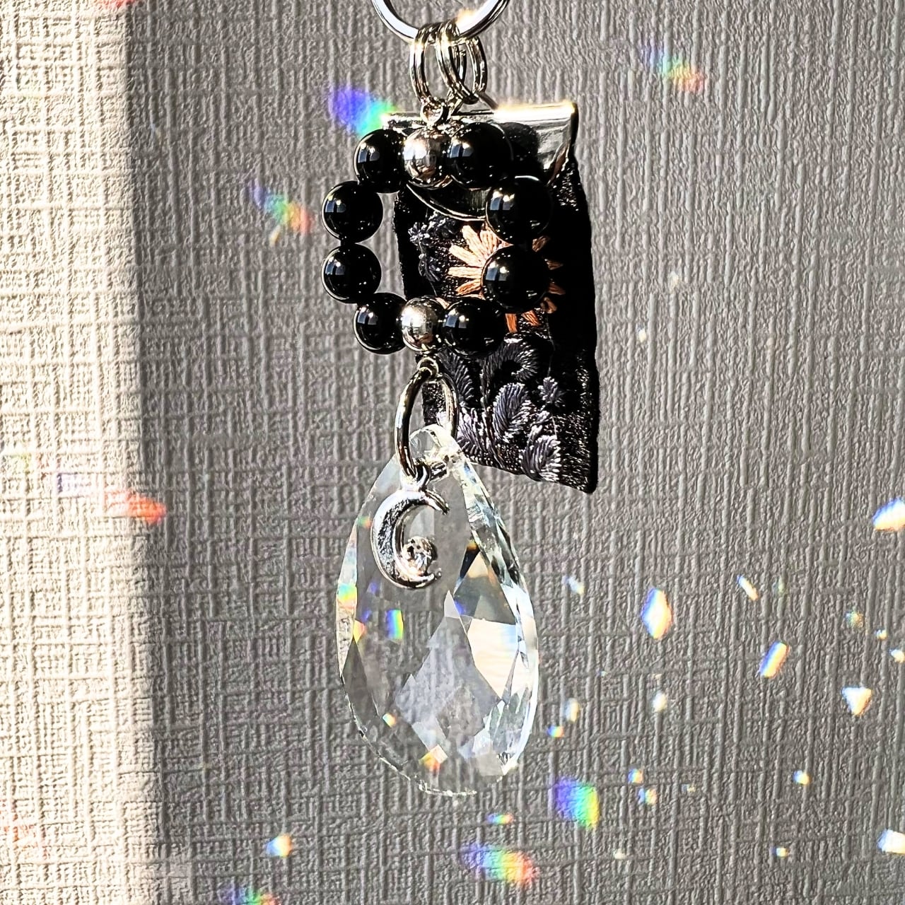 天然石のオニキスをリング状に組み合わせ、シルバーの三日月の下で揺れるクリスタルが、迷いのないクリアな光であなたを光と虹で包み込みます。