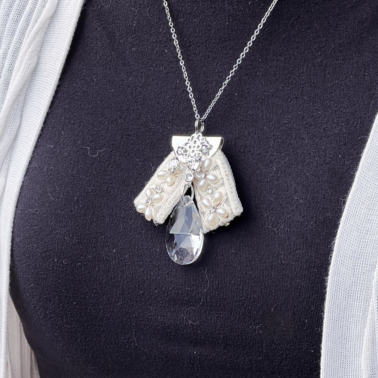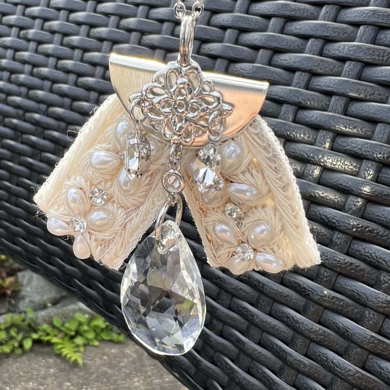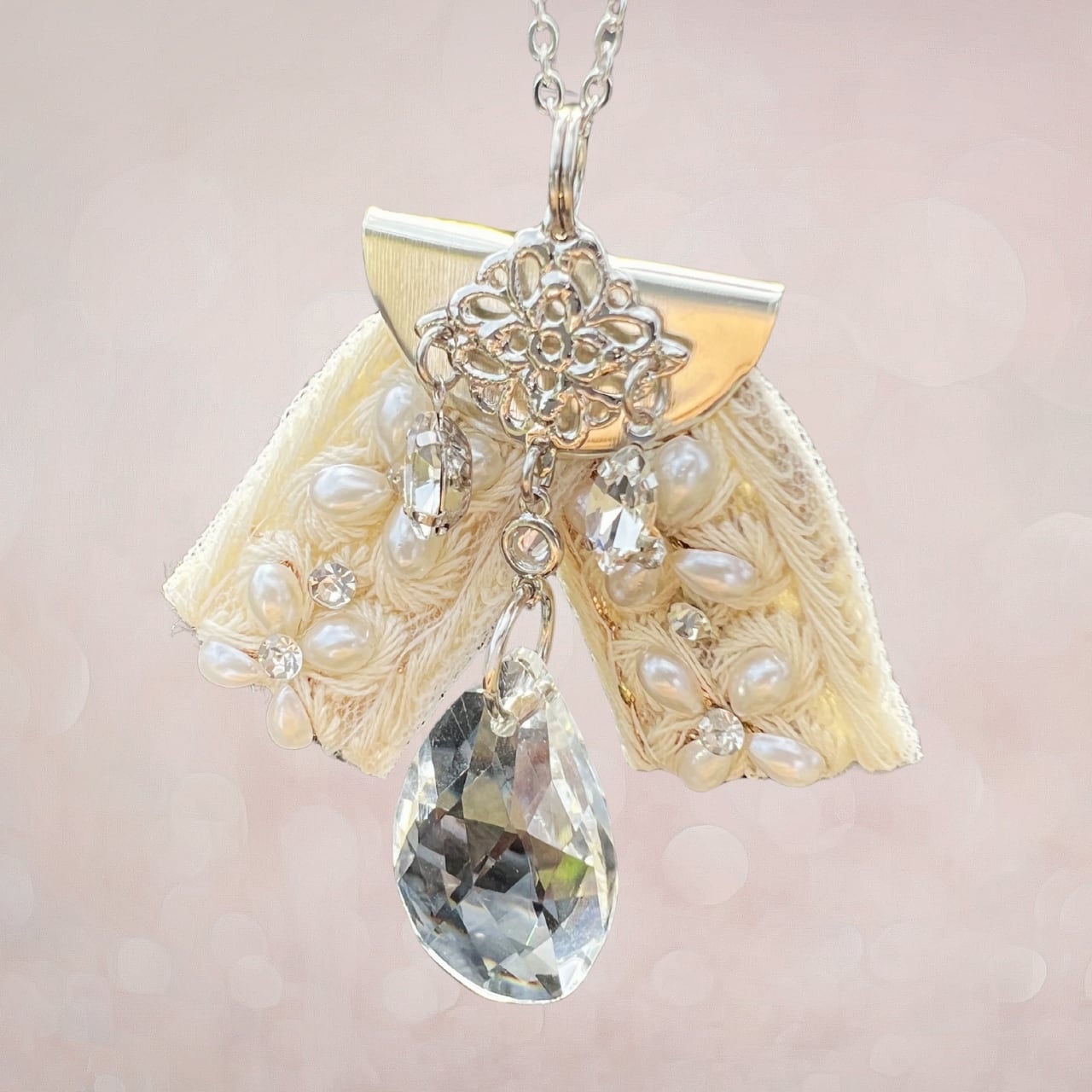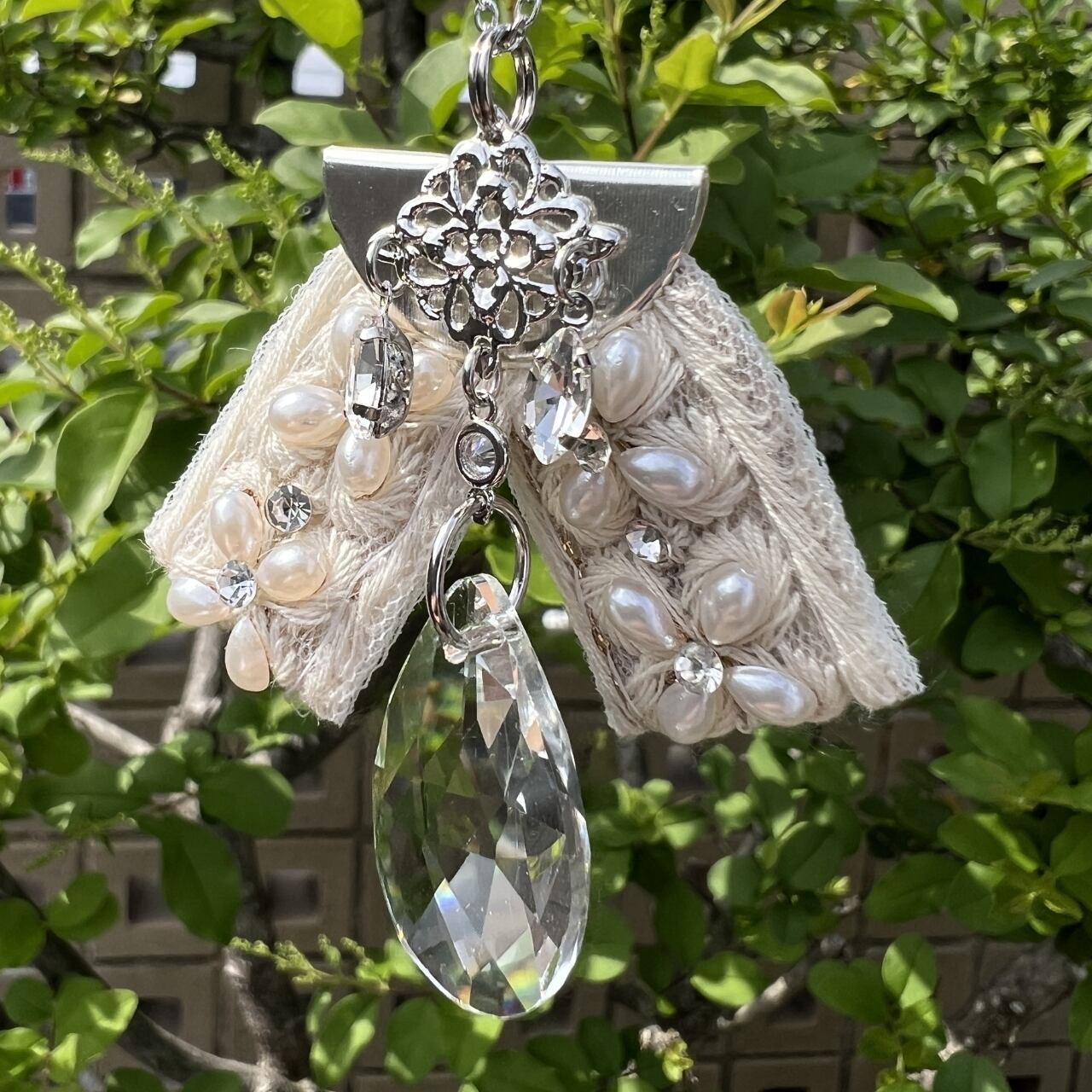 白をベースとしたインド刺繍リボンの中にパール調のパーツが組み込まれています。本ロジウムの白銀のチェーンやチャームを使い、ホワイト系に仕上げたサンキャッチャーペンダントです。